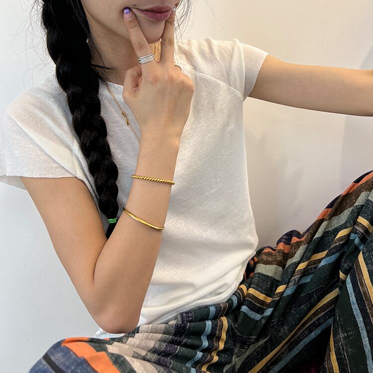 袖の切りっぱなしデザインもポイントで、どんなスタイリングにも合わせやすいアイテムです。