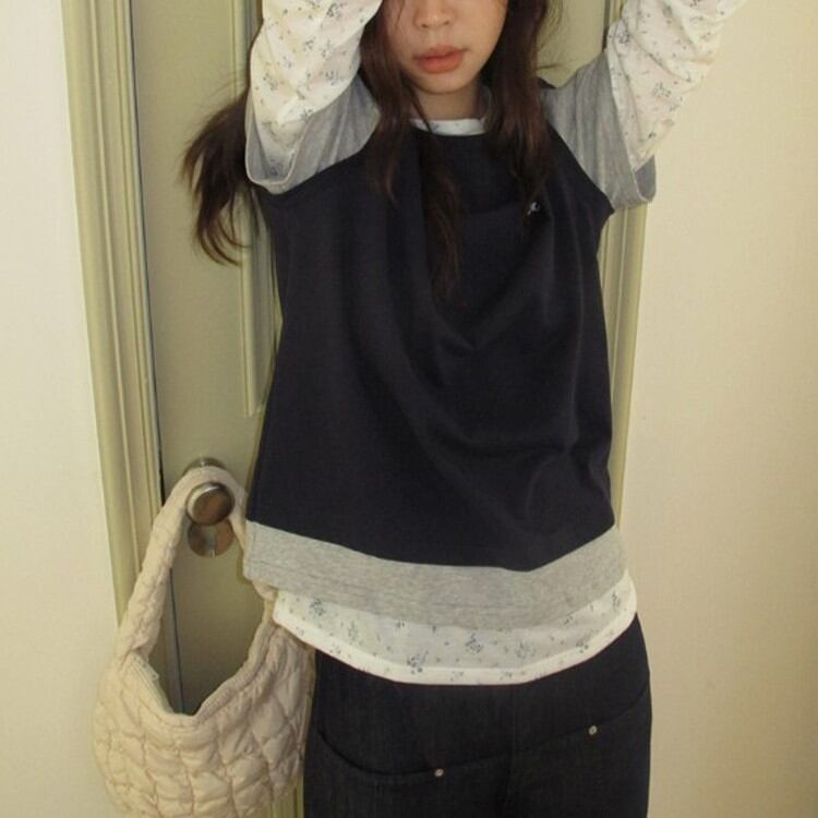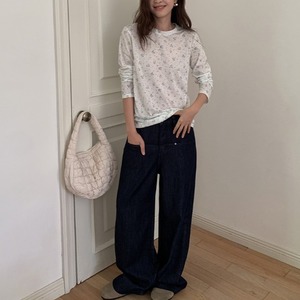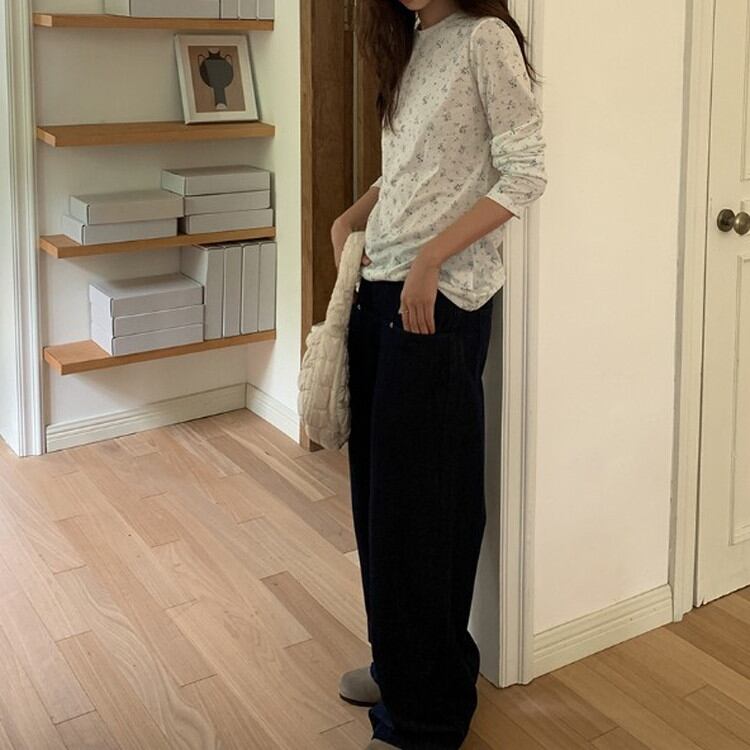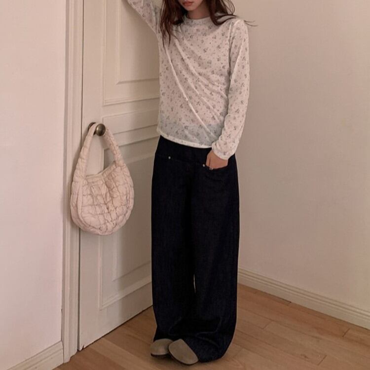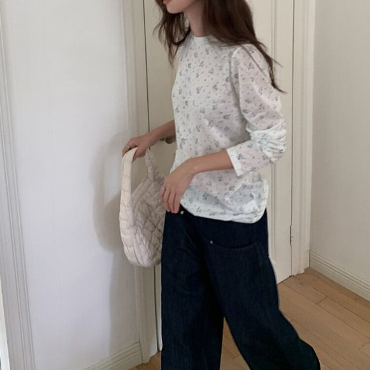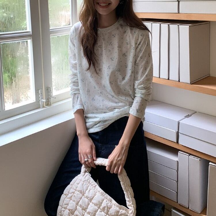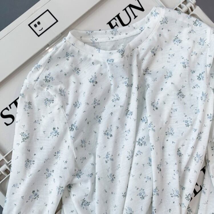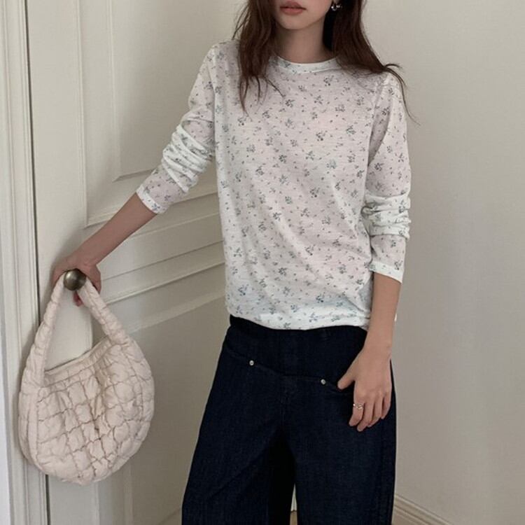 ガーリーなクルーネック総柄シアーロングTシャツです。