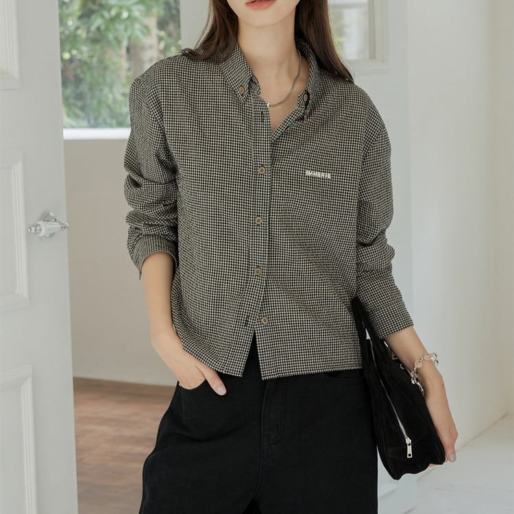 胸元の刺繡ロゴがポイントのリネンブレンドチェックショートシャツです。