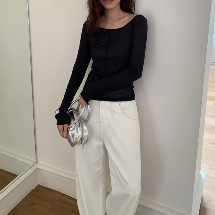 大人っぽいスリムフィットワイドネックロングTシャツです。