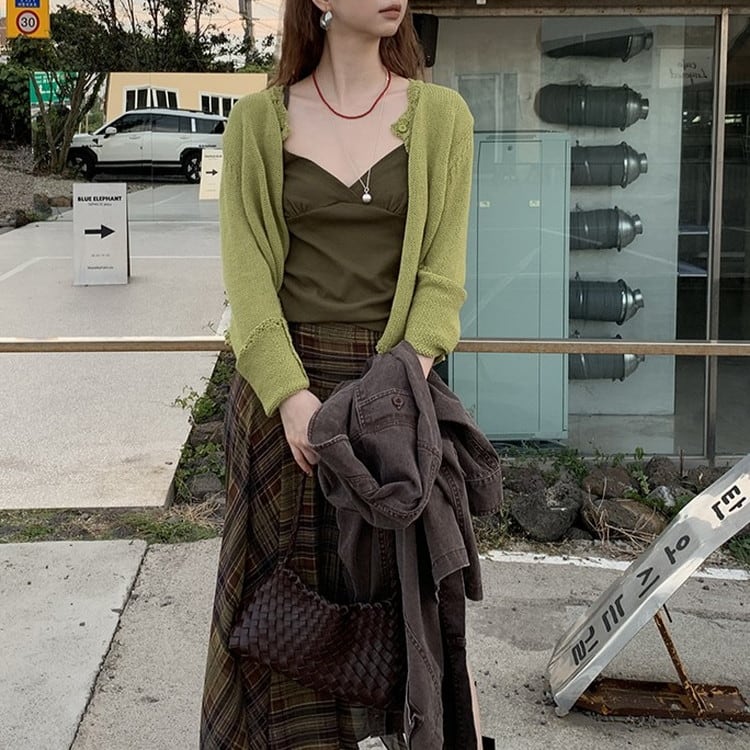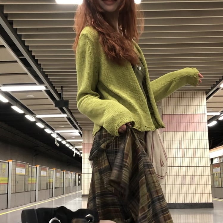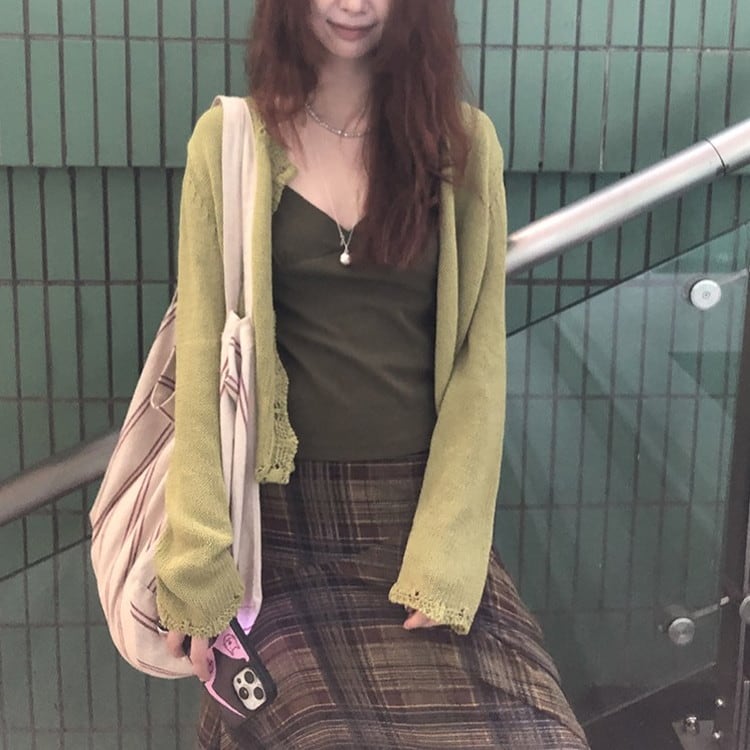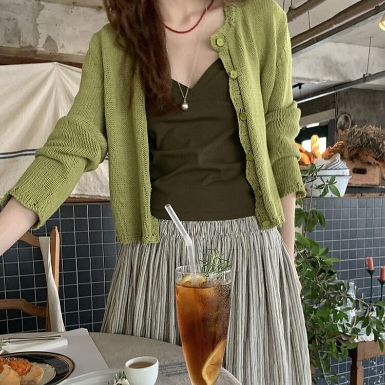 おしゃれ度がアップするグリーンコットンニットカーディガンです。