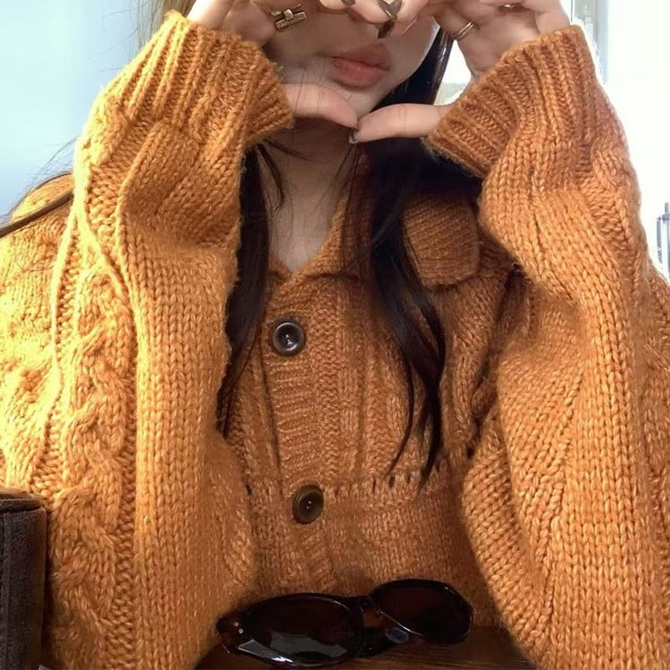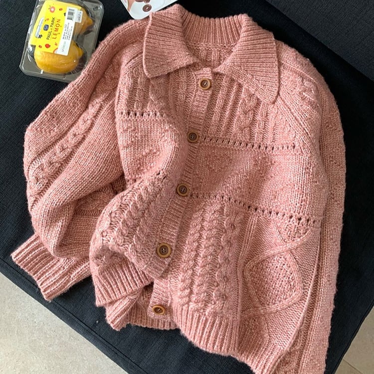 ポロカラーケーブルニットカーディガン 3color [am03382]