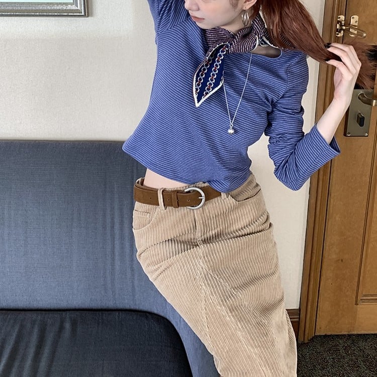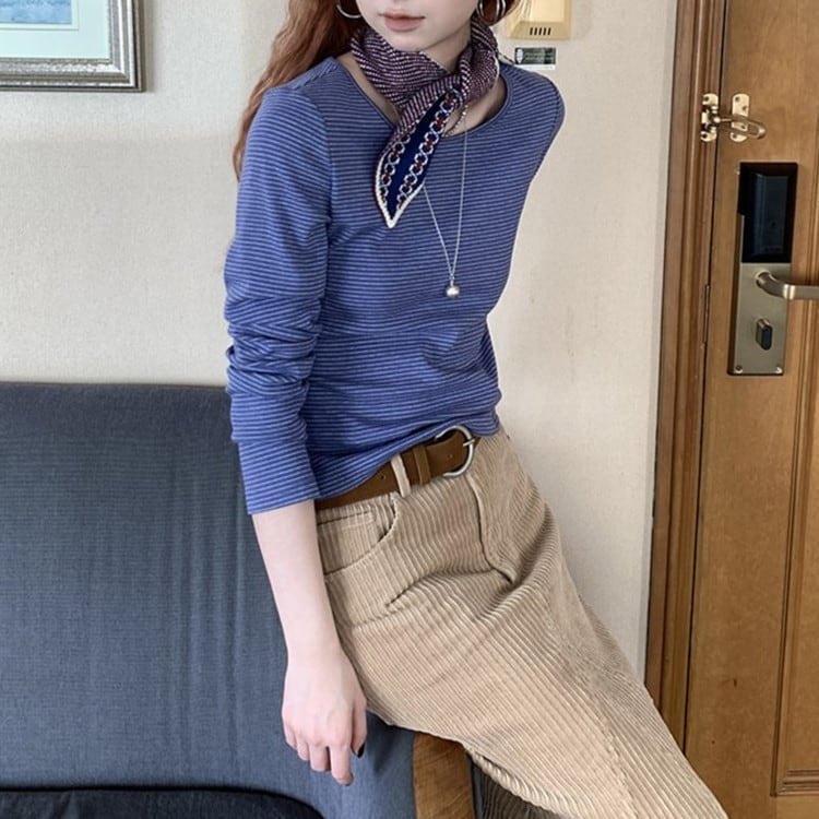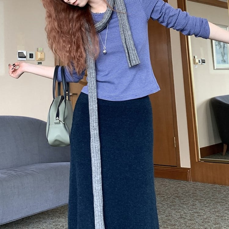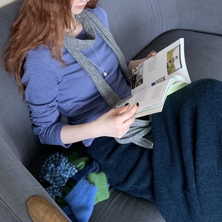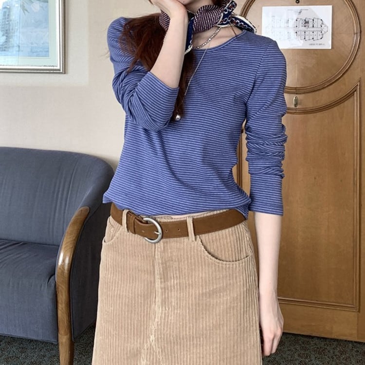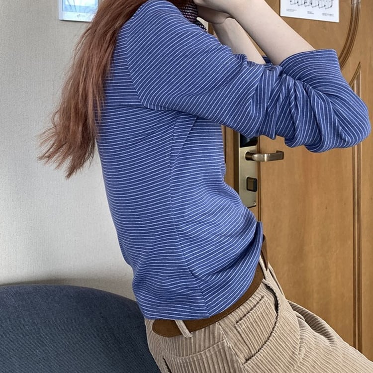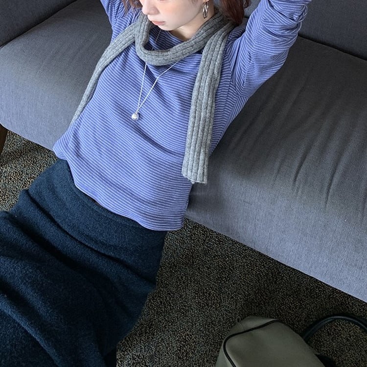 大人っぽいスリムフィット細ボーダーロングTシャツです。