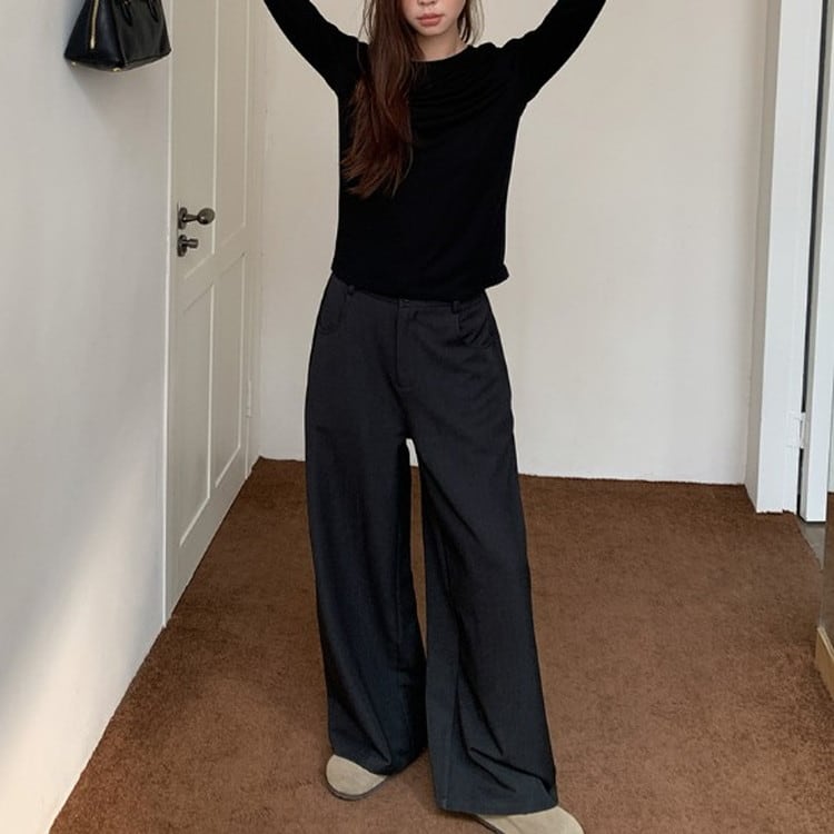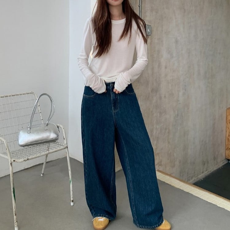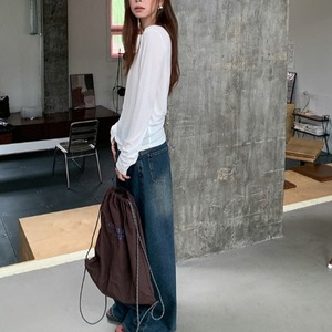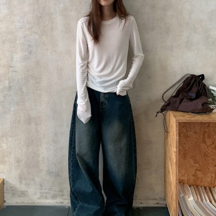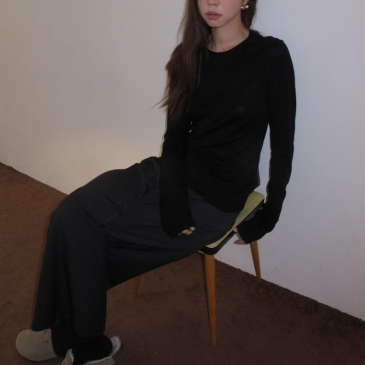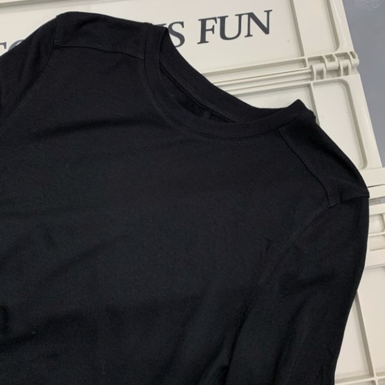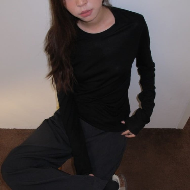 コーディネートを選ばないテンセルクルーネックロングTシャツです。