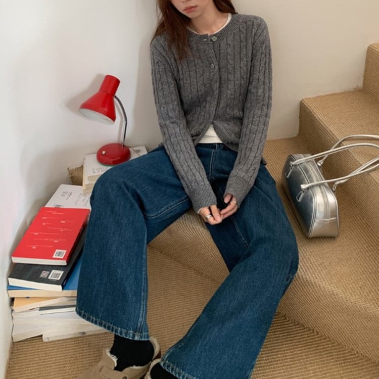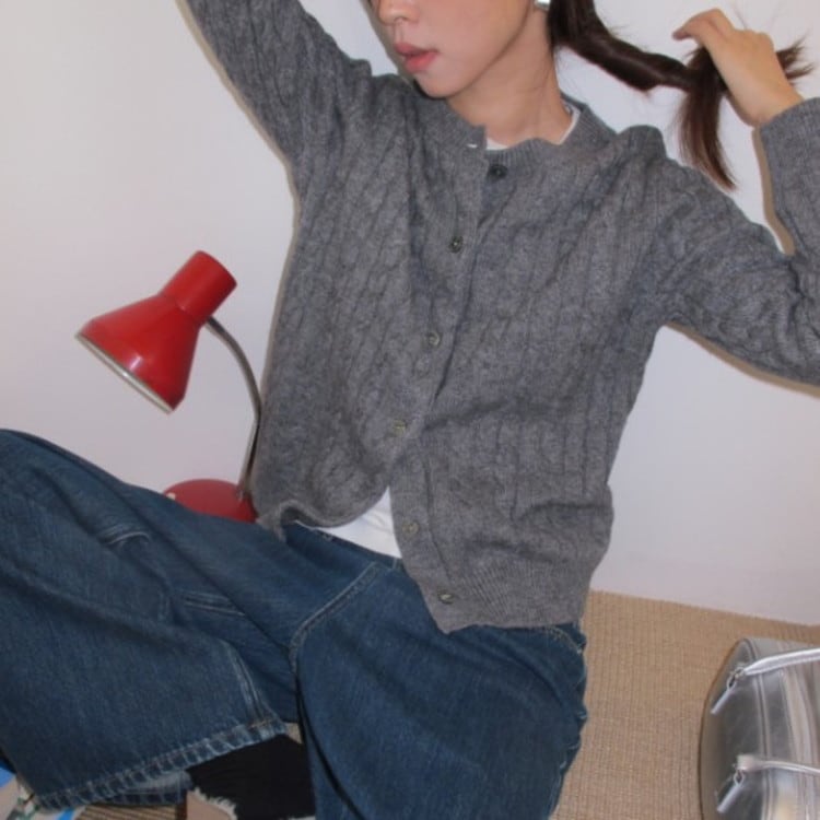 クラシカルな印象のクルーネックケーブルニットカーディガンです。