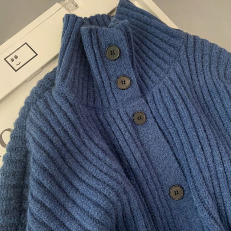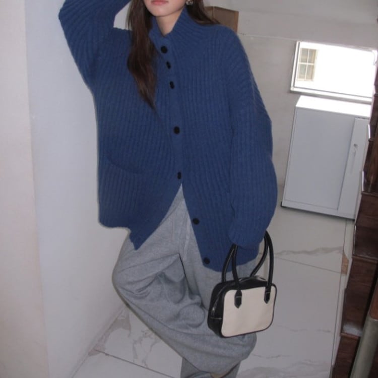 温もり感のあるオーバーサイズスタンドカラーワイドリブニットカーディガンです。