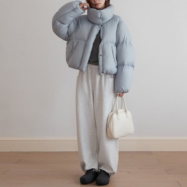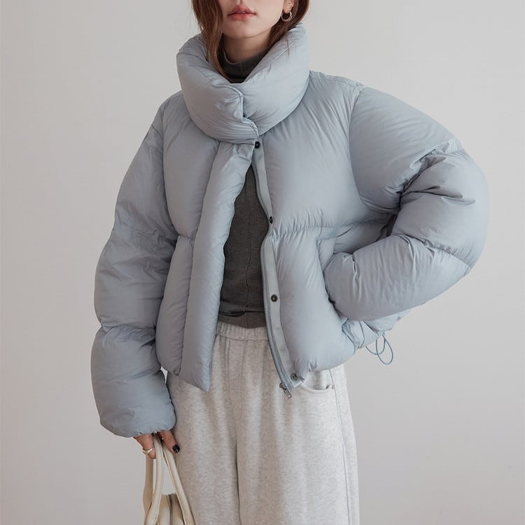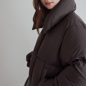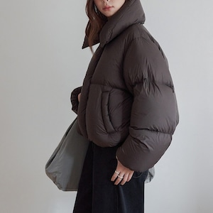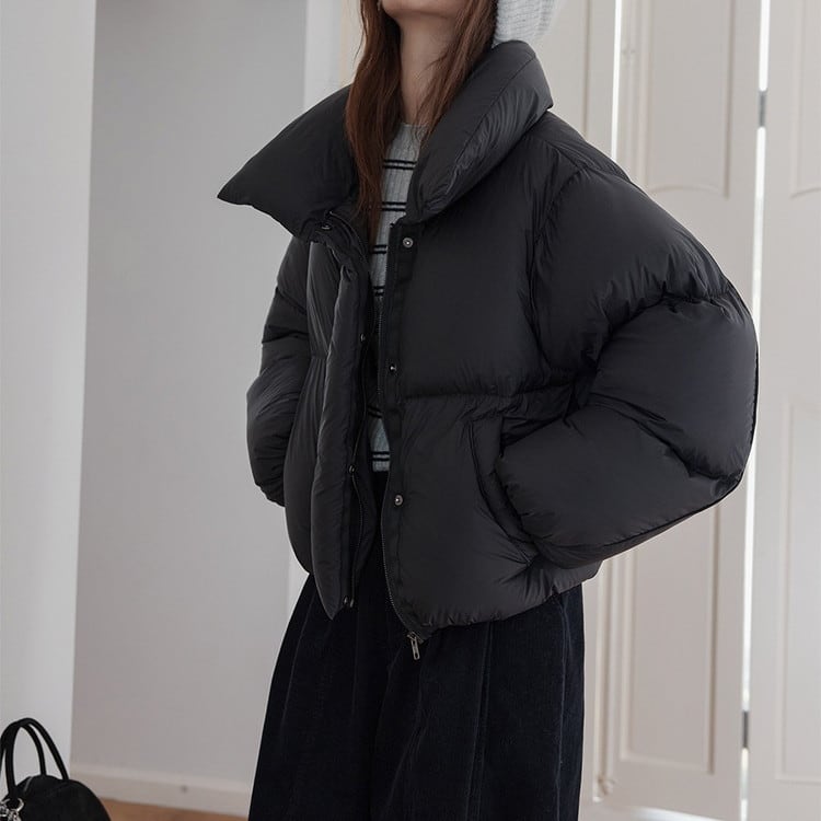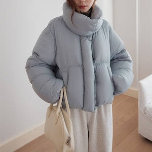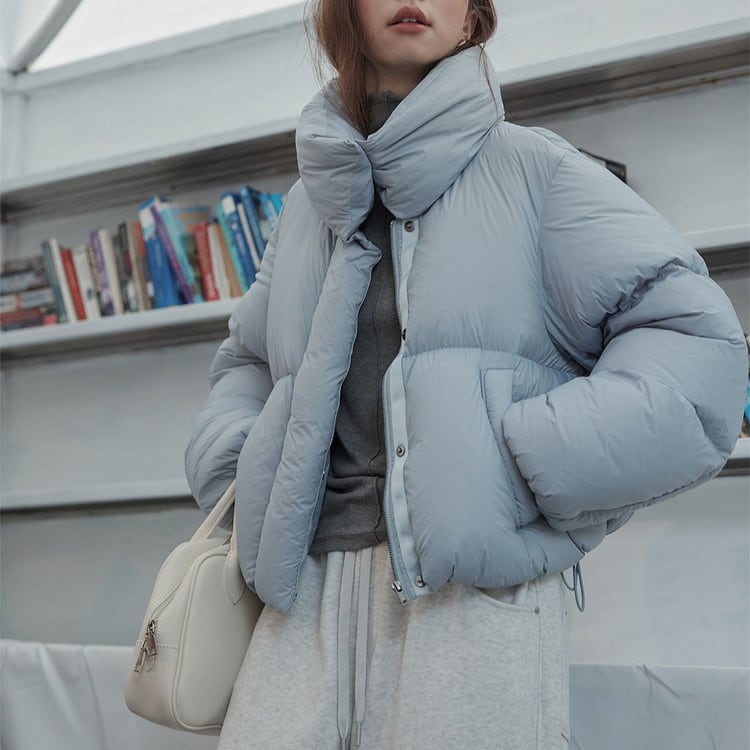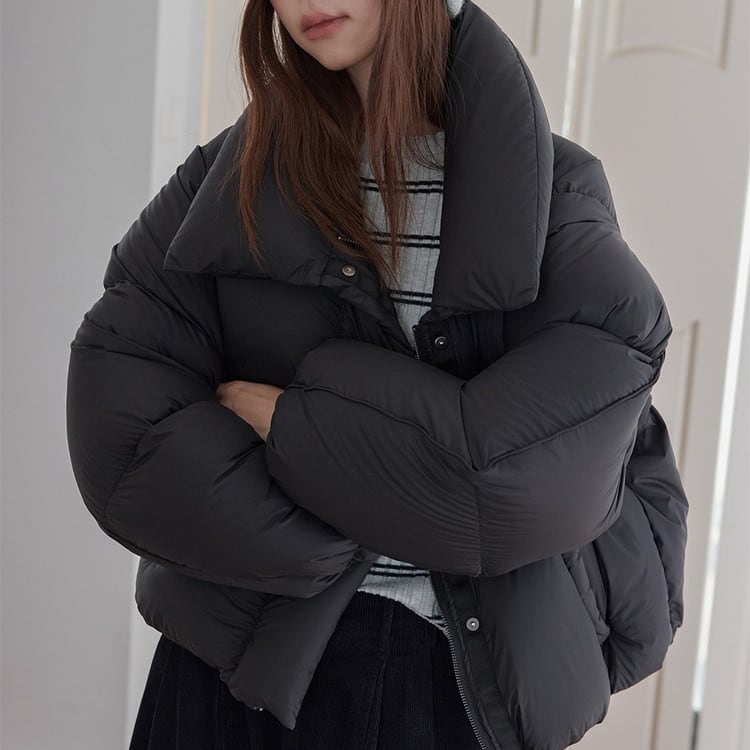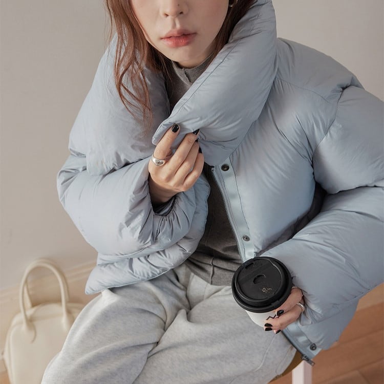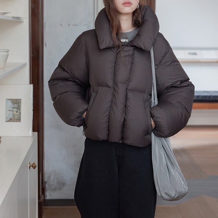 ぷっくりとした立体感のあるスタンドカラーショートダウンジャケットです。
