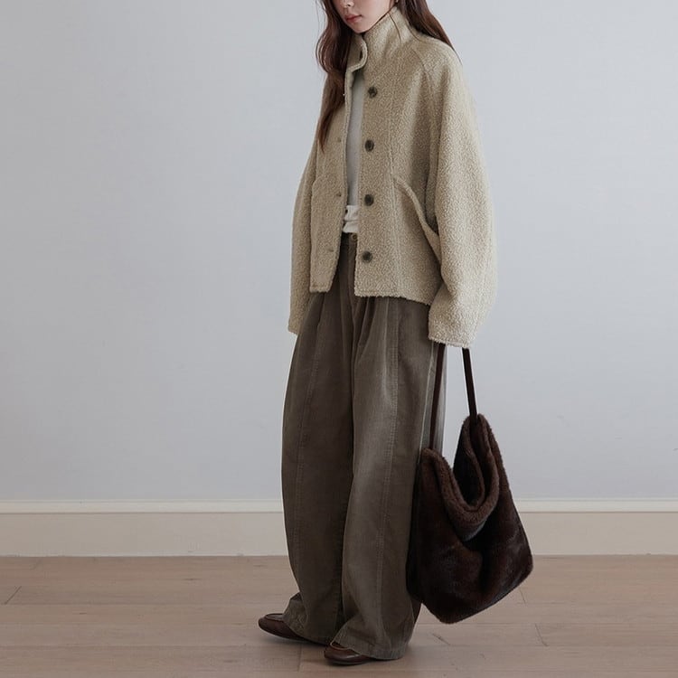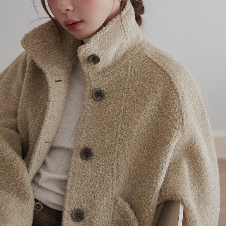 軽くて暖かいウールブレンドスタンドカラーショートコートです。