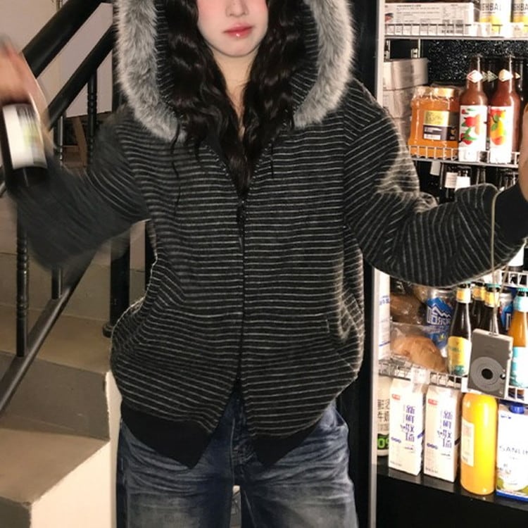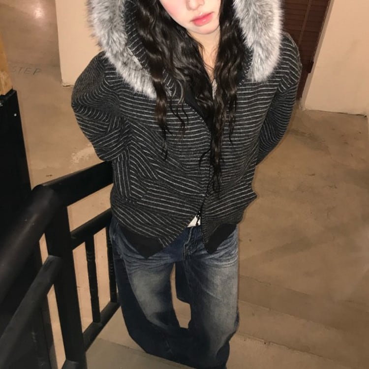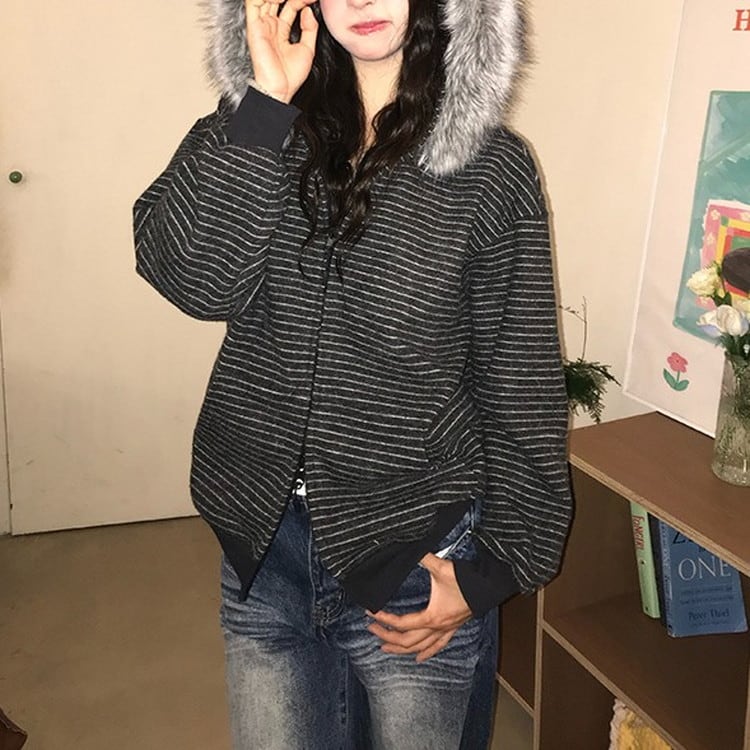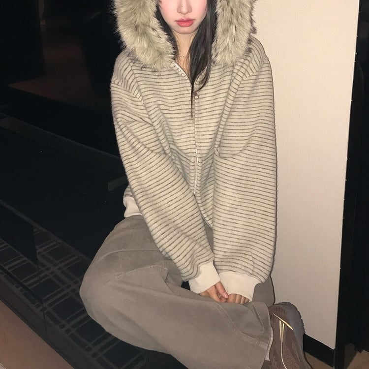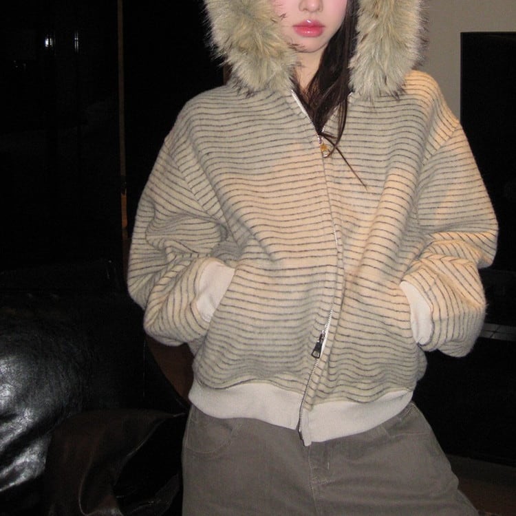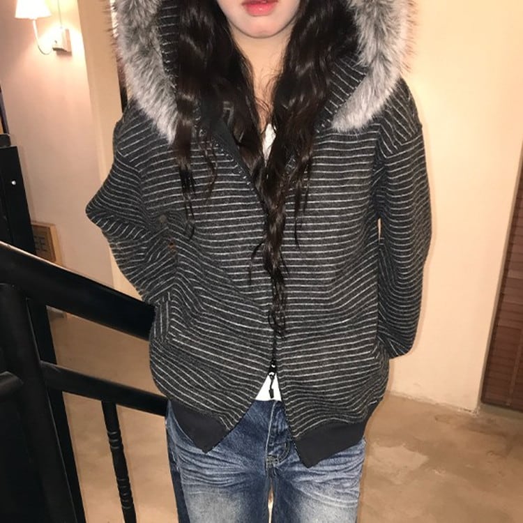 取り外し可能なファーと起毛感のあるボーダー生地が魅力的◎