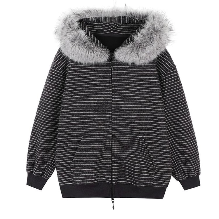 羽織りとしてぴったりなボーダージップアップファーフーディです。