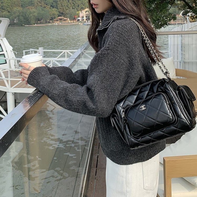 フロントのポケットデザインがポイントのハイカラーフルジップニットです。