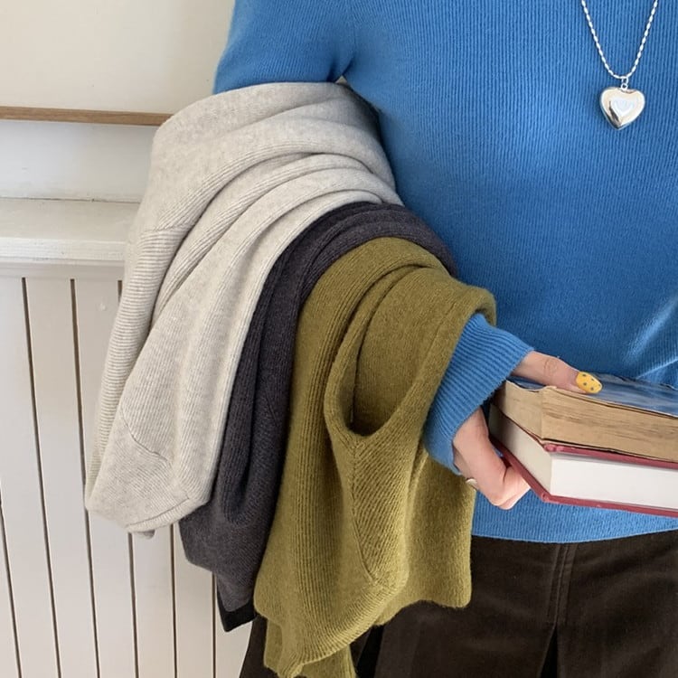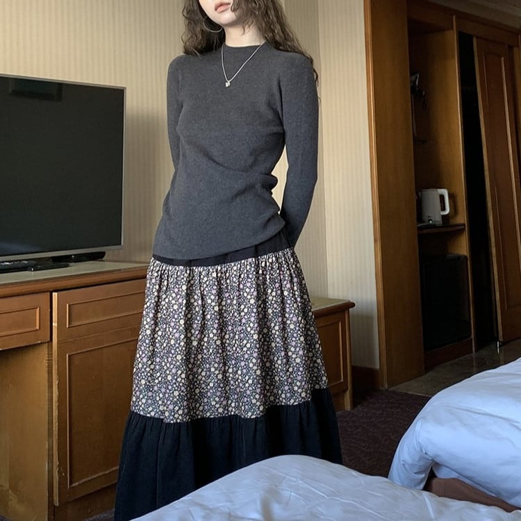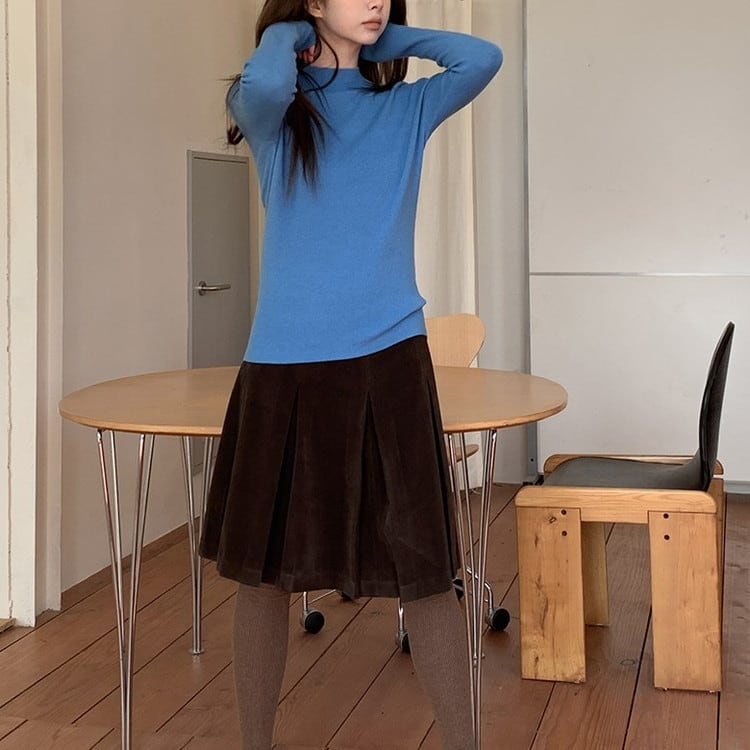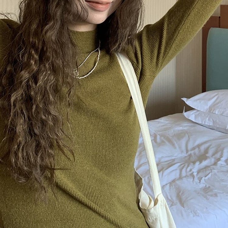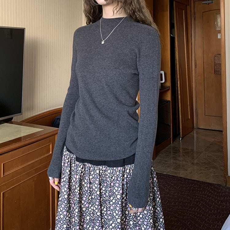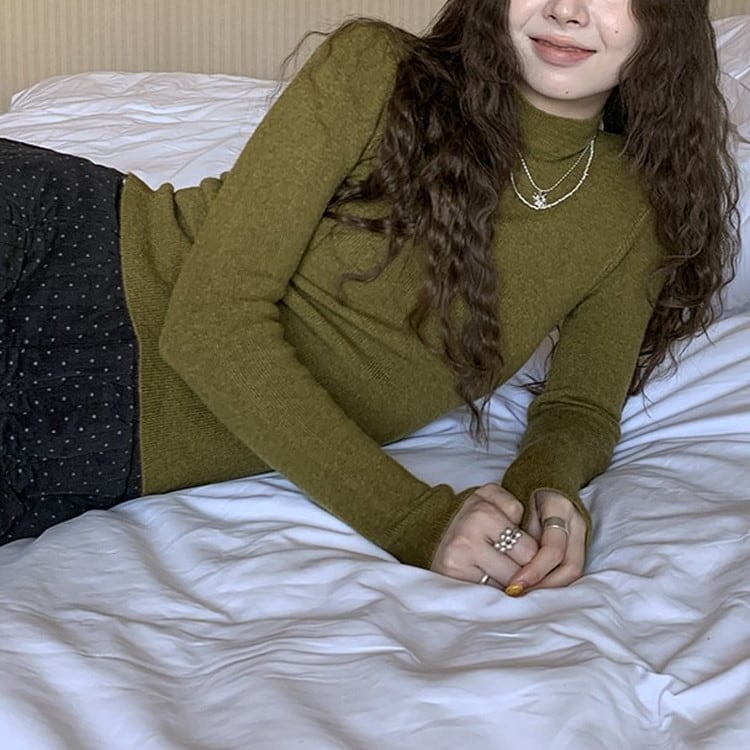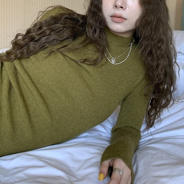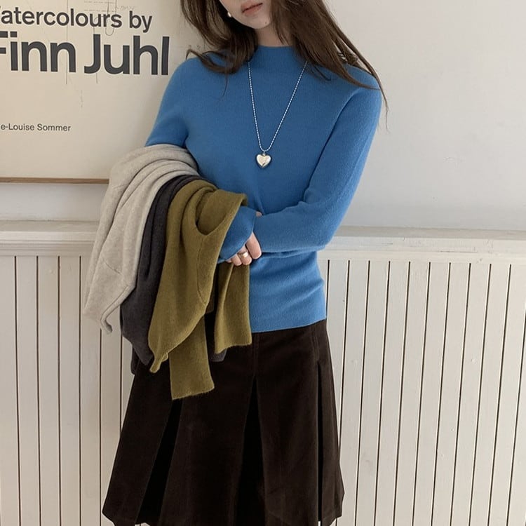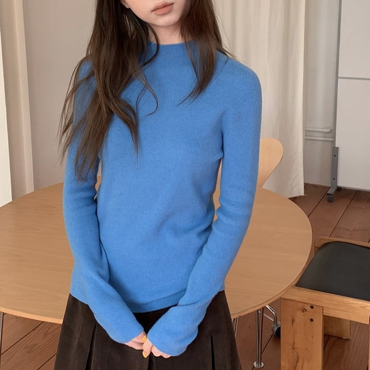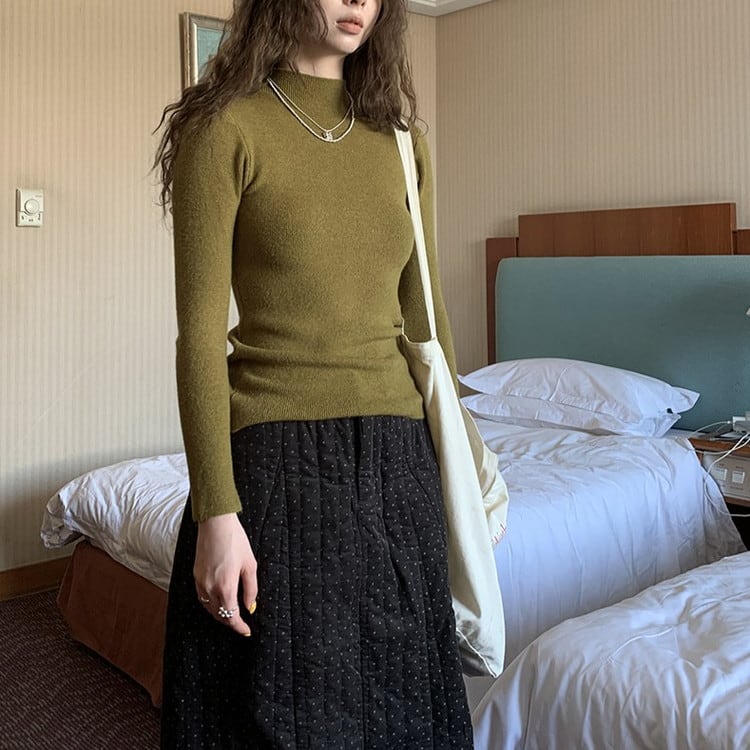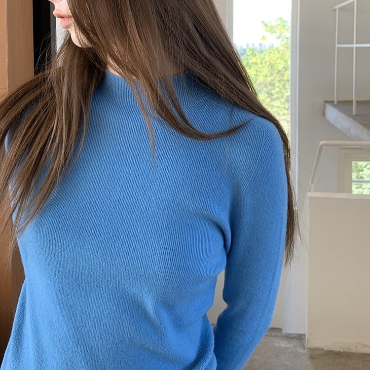 伸縮性のあるスリムフィットモックネックリブニットです。