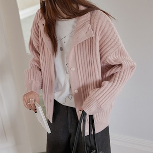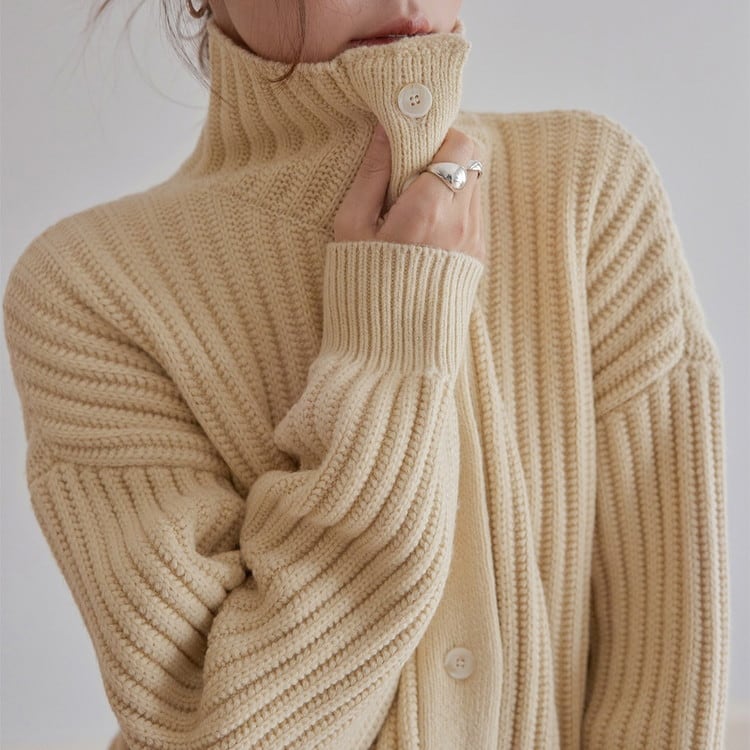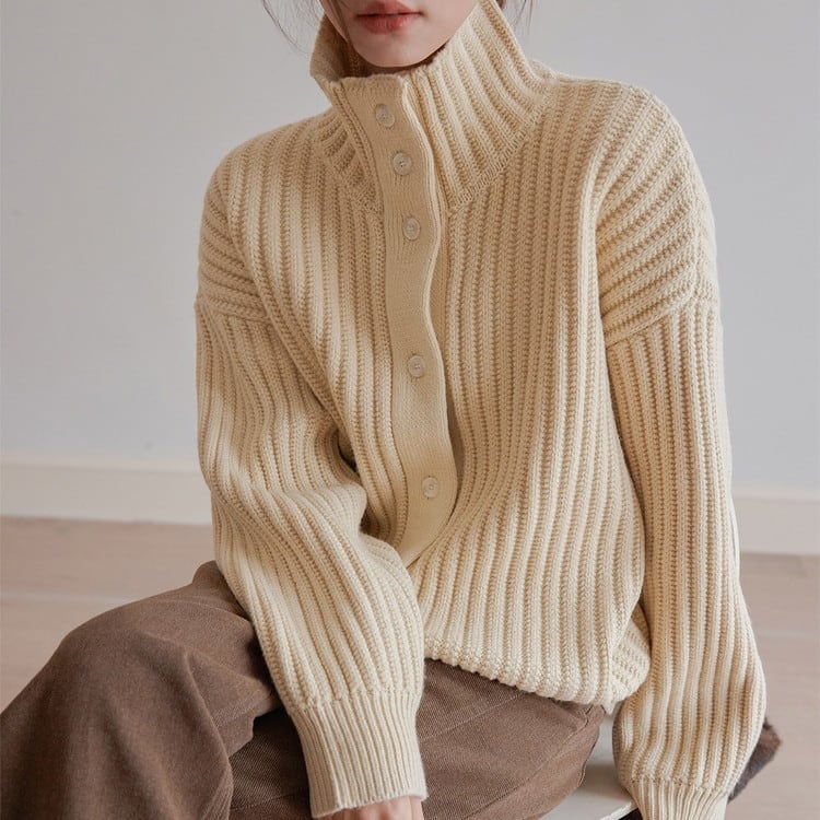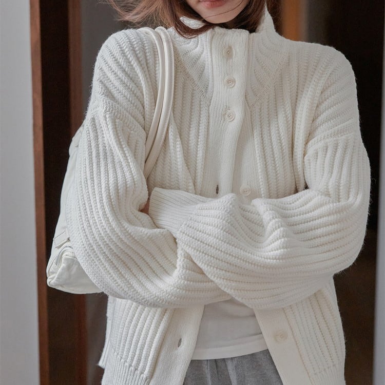 上品さと抜け感を兼ね備えたワイドリブスタンドカラーカーディガンです。