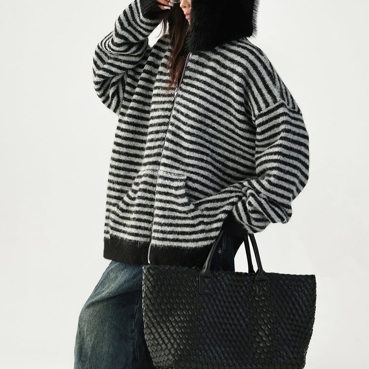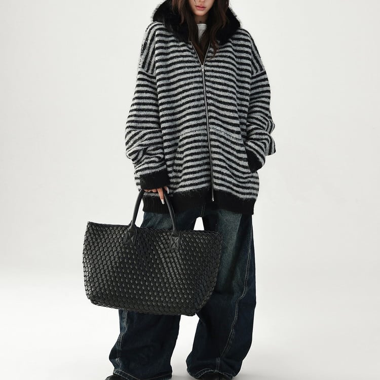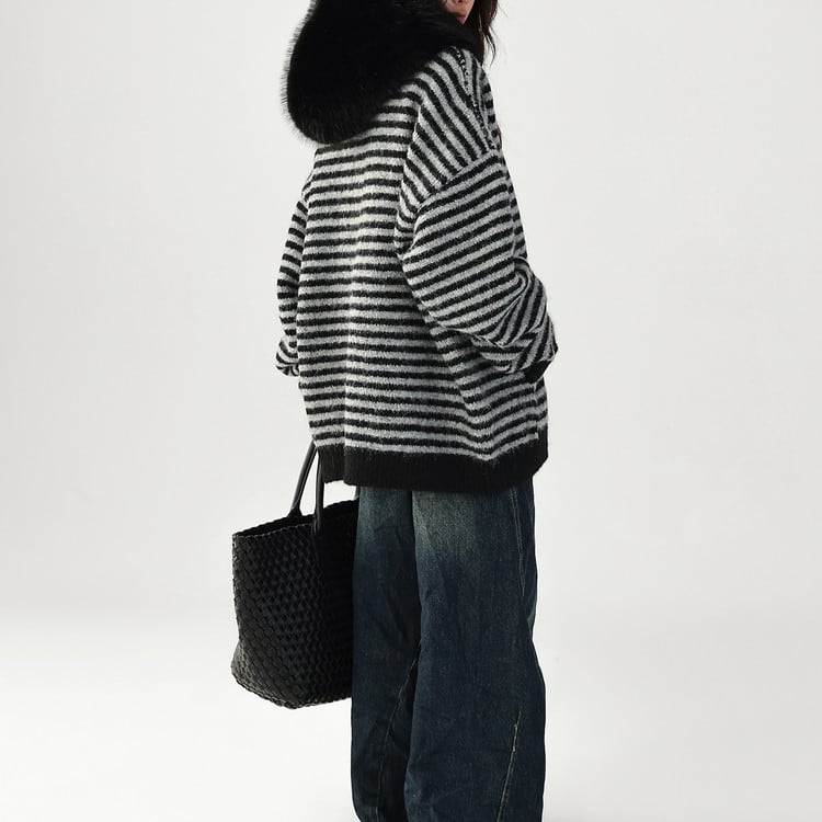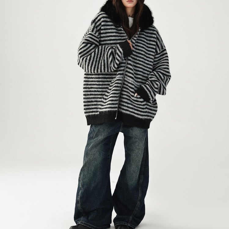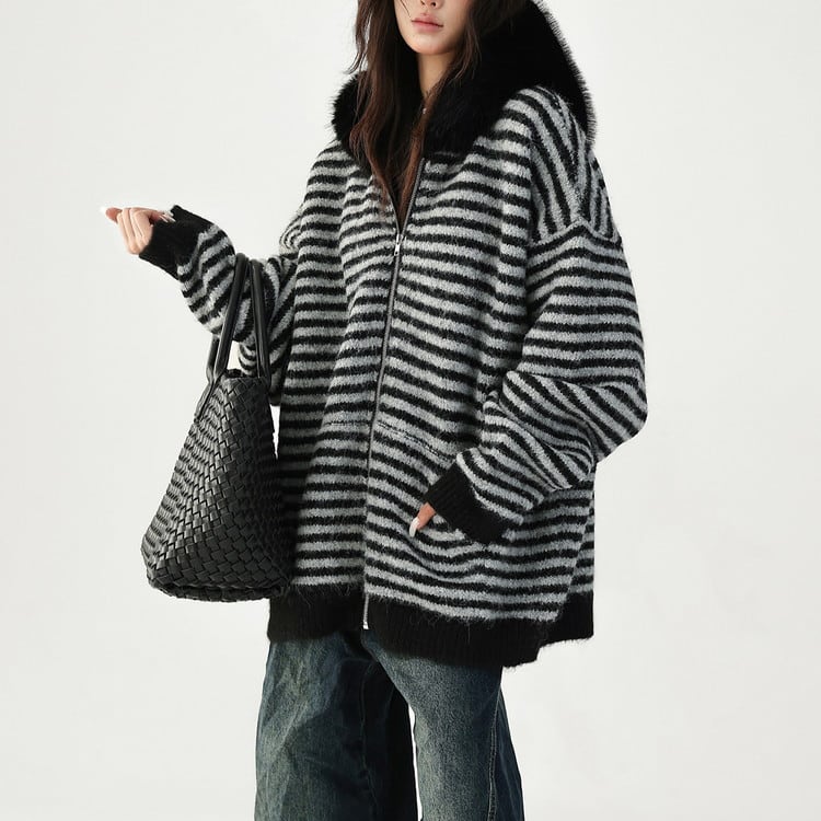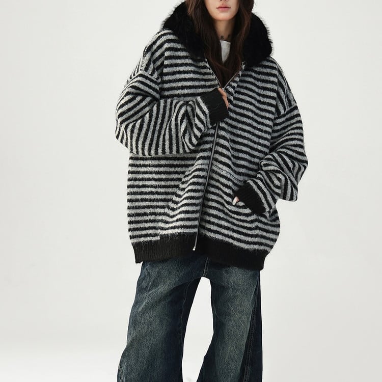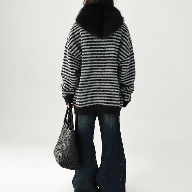 オーバーサイズボーダーニットファーフーディ [am03551]