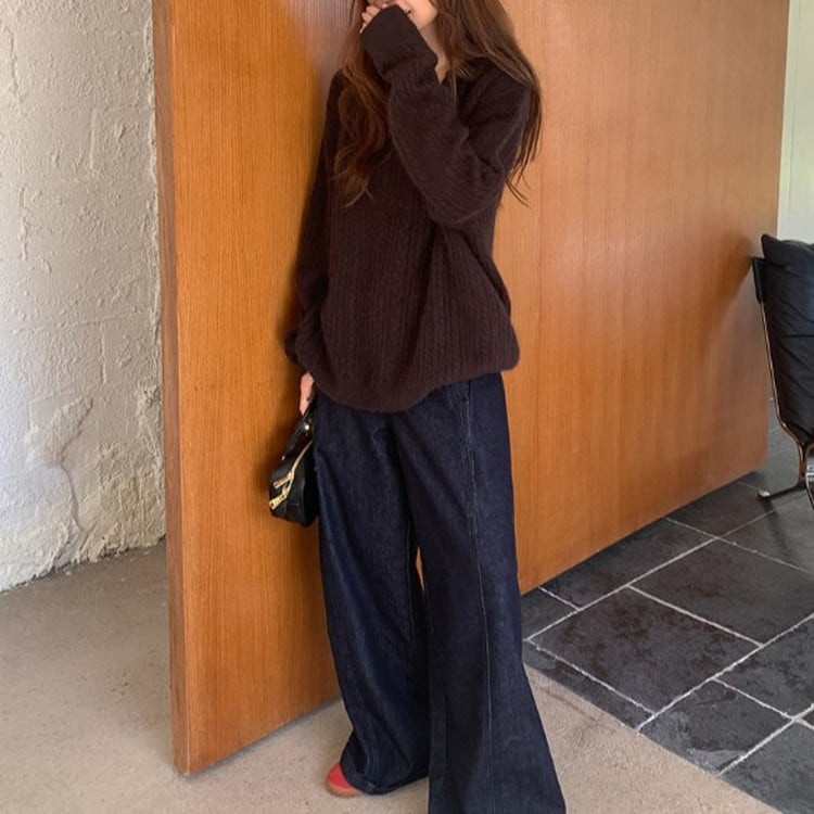 大人っぽい印象のキーネックブラウンケーブルニットです。