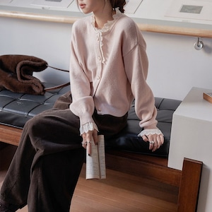 フェミニンな印象のレーストリムニットカーディガンです。