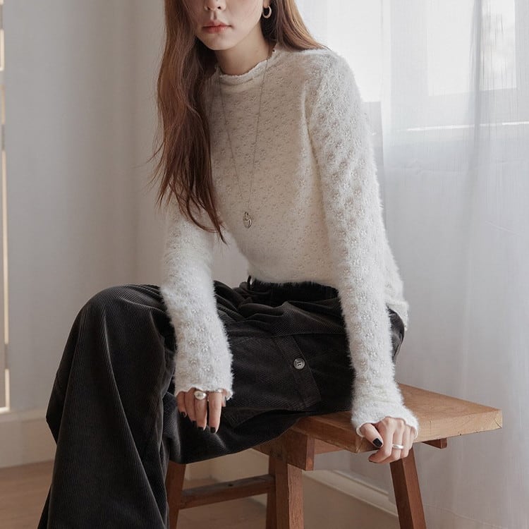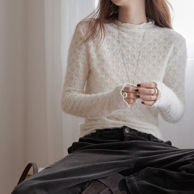女性らしい印象のモックネックレースジャガードロングTシャツです。
