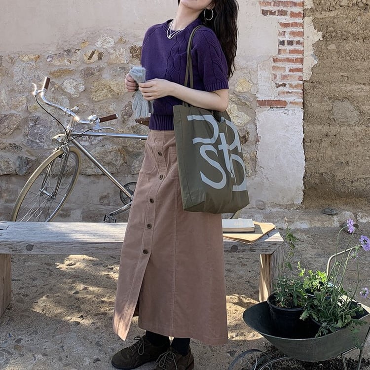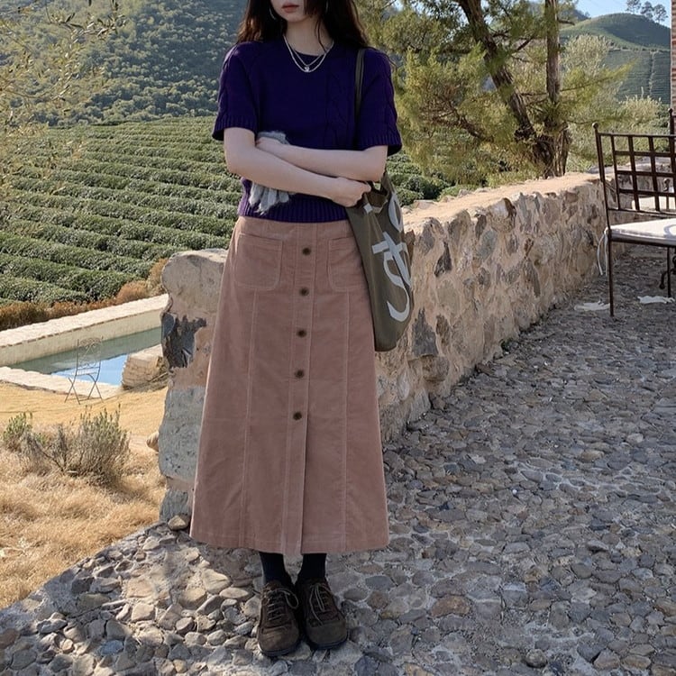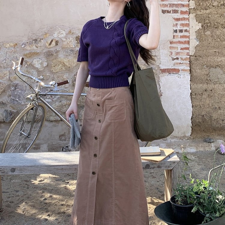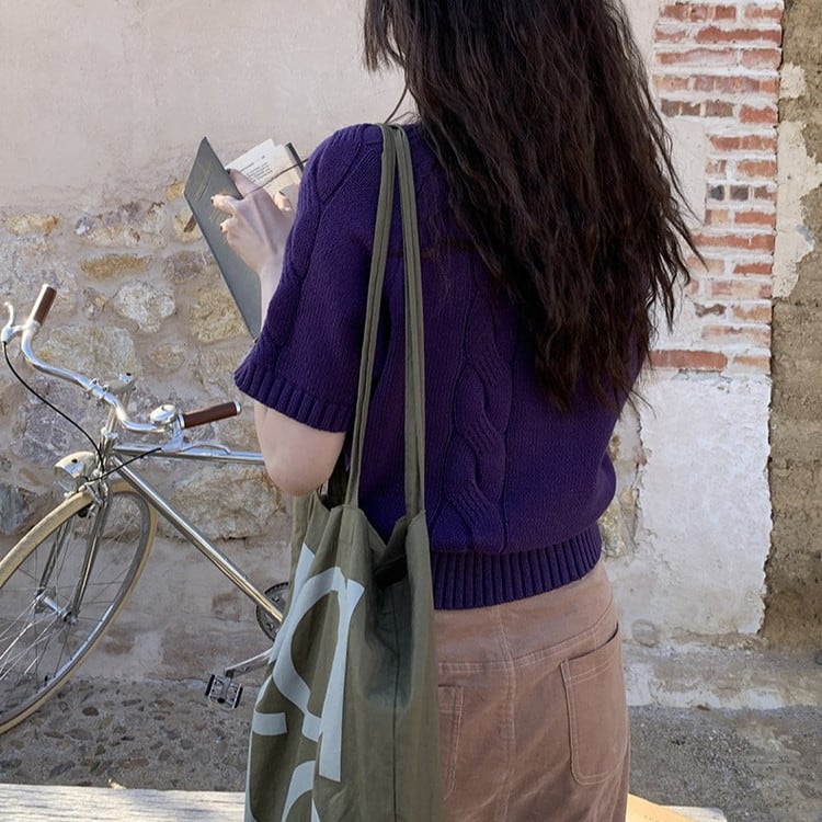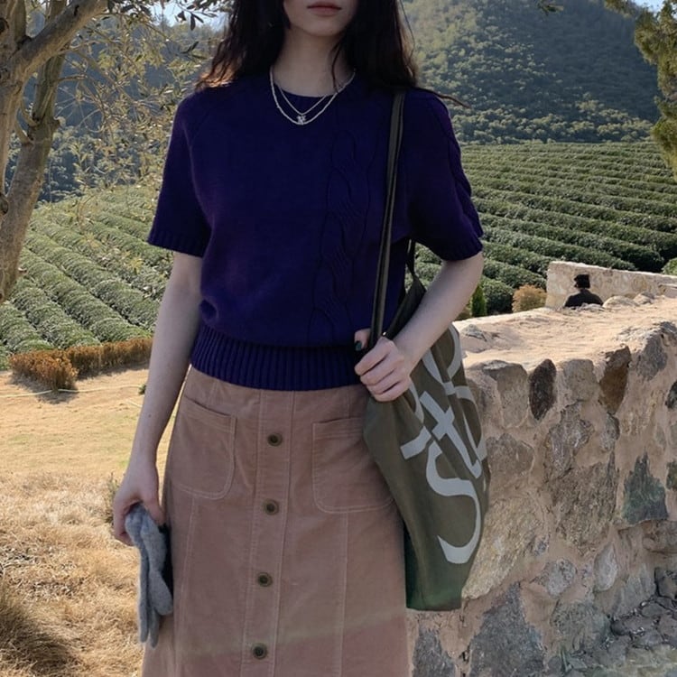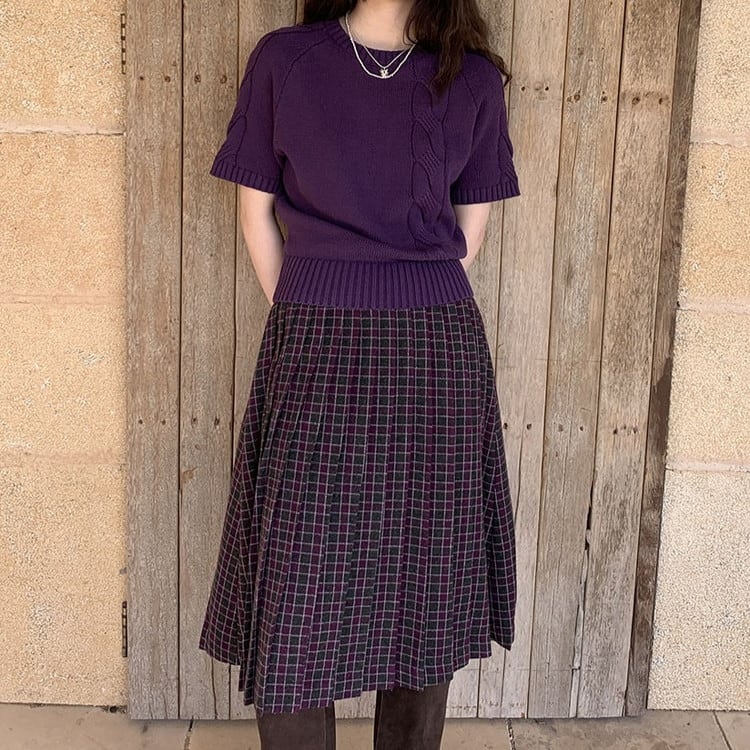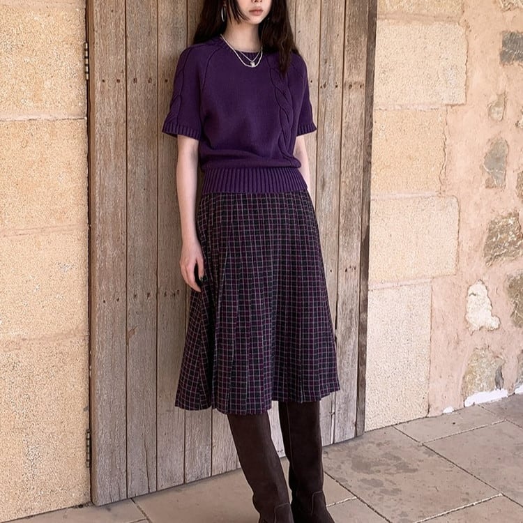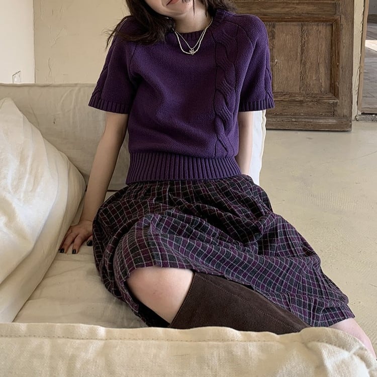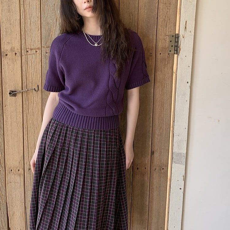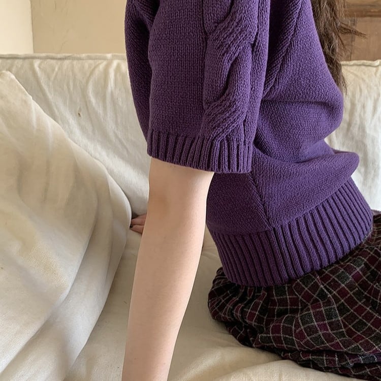 春まで活躍するパープル半袖ケーブルニットです。