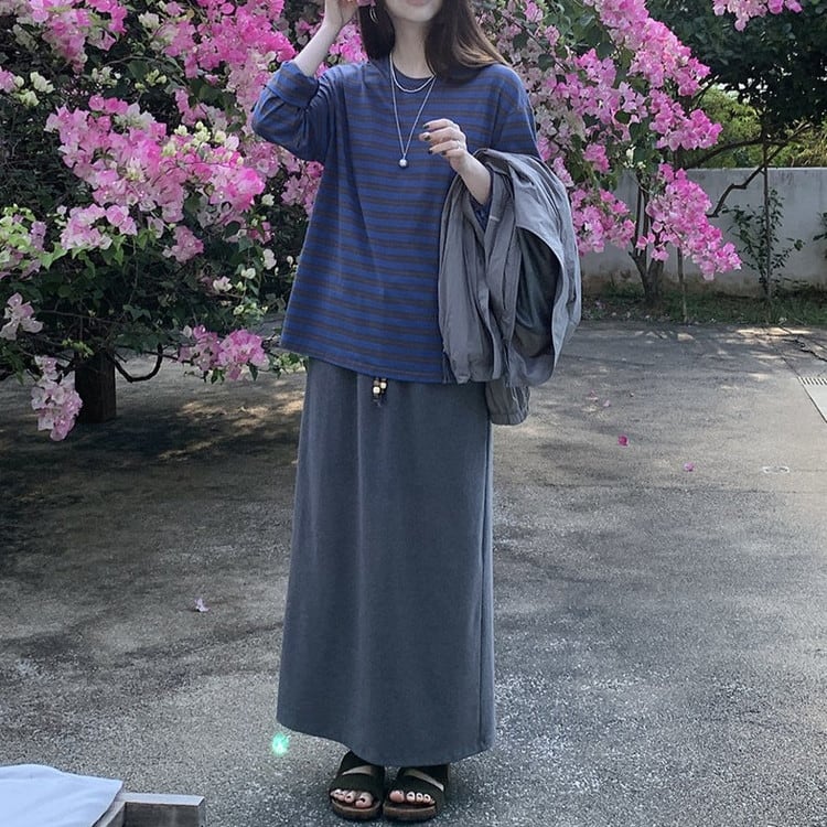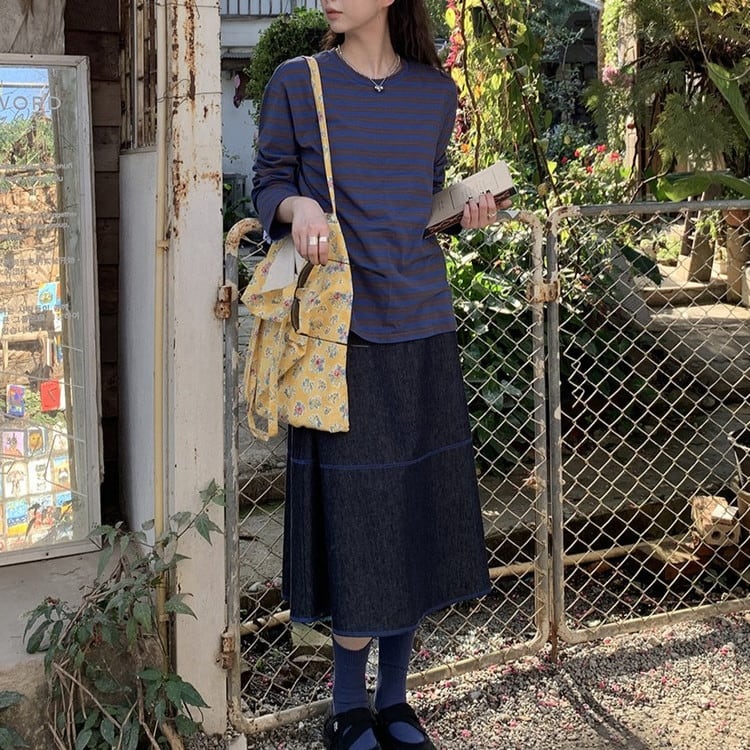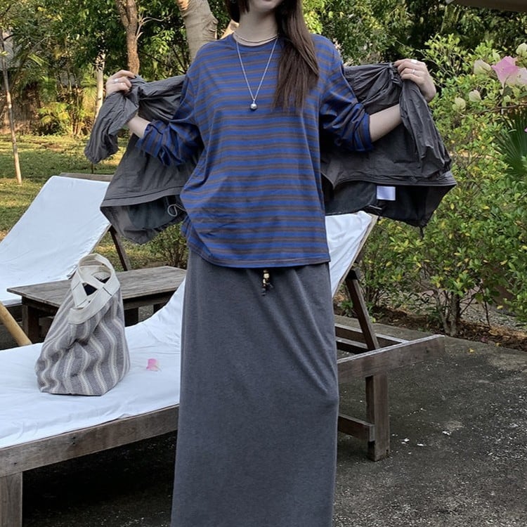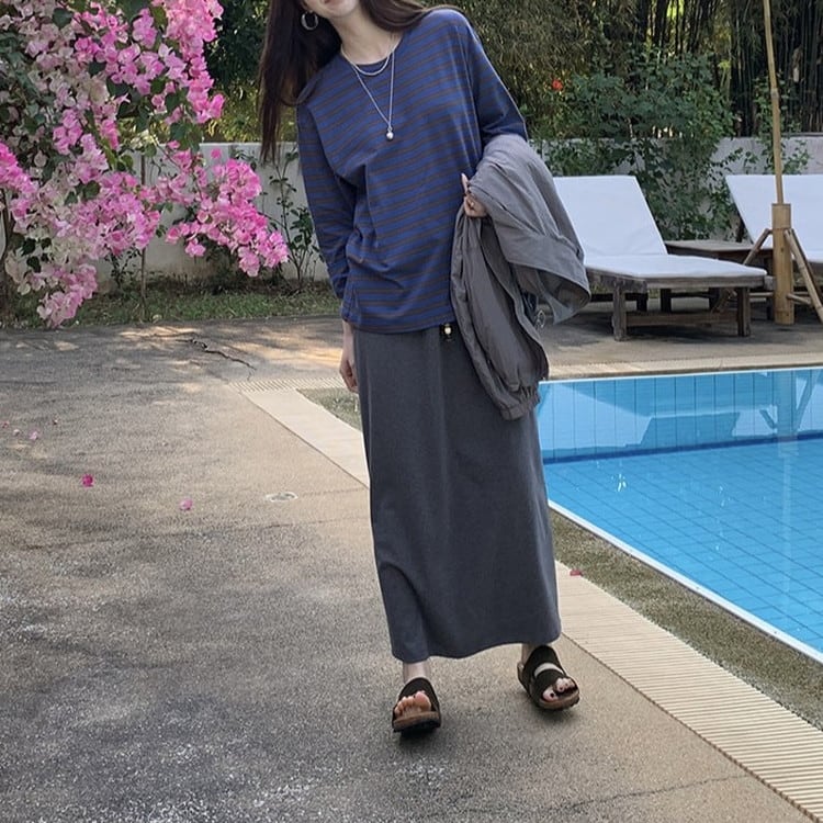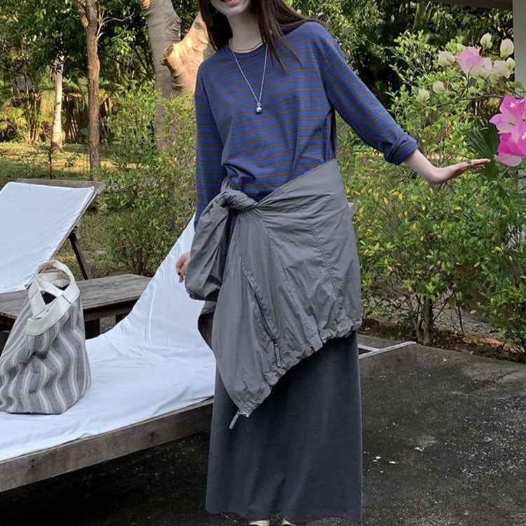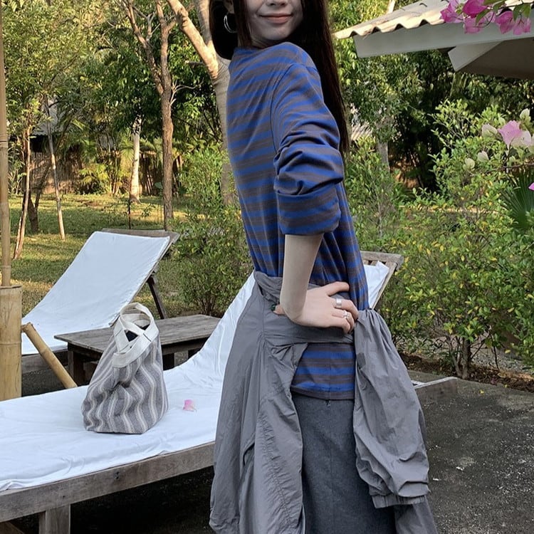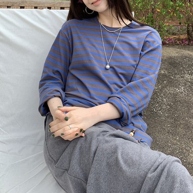 着回し力抜群のクルーネックブルーボーダーロングTシャツです。
