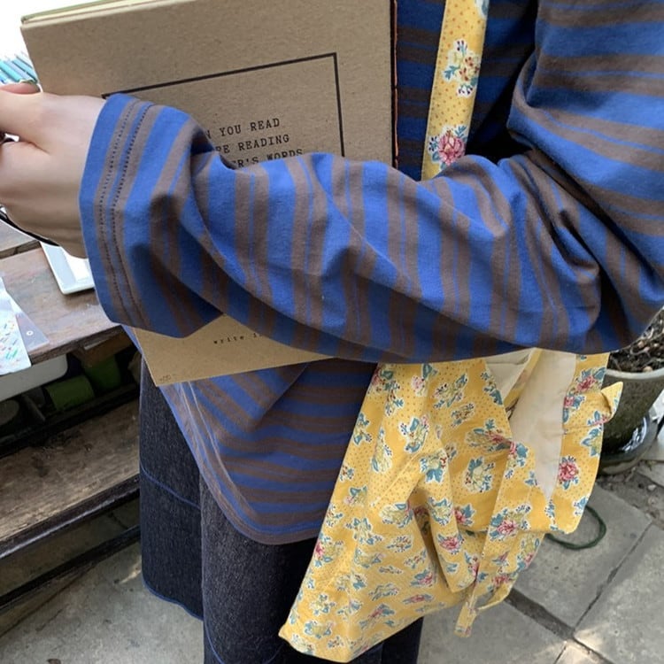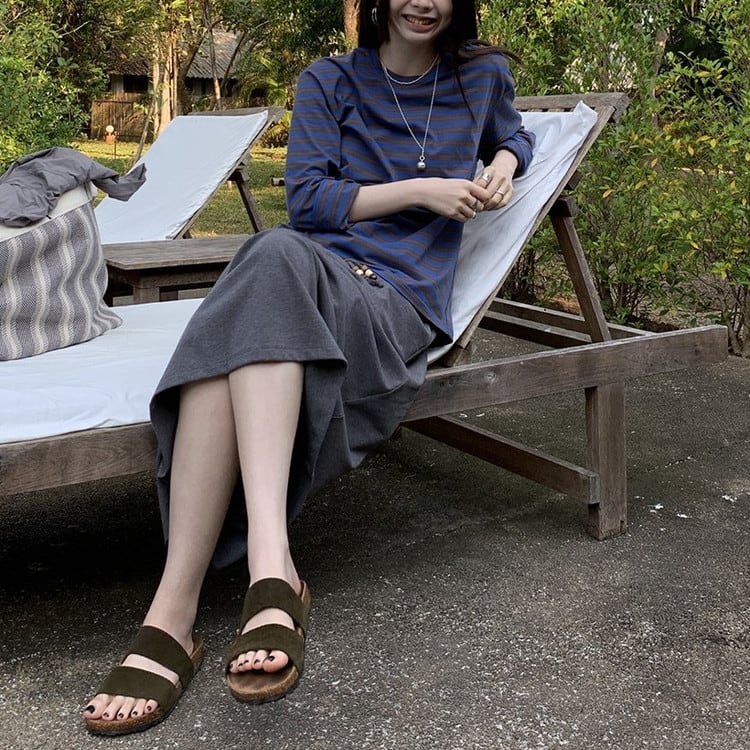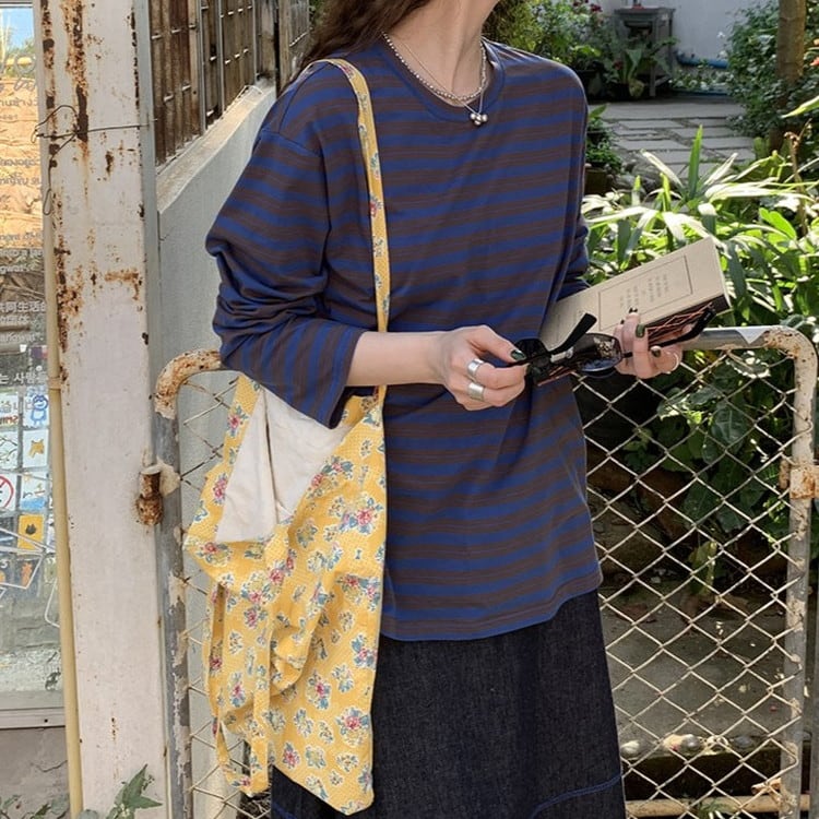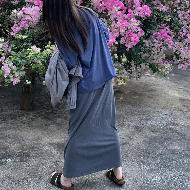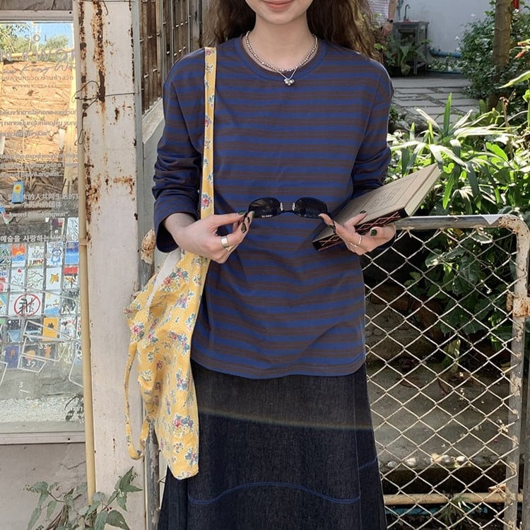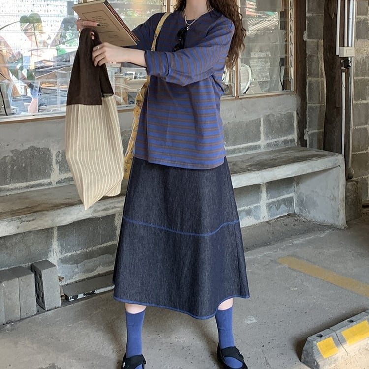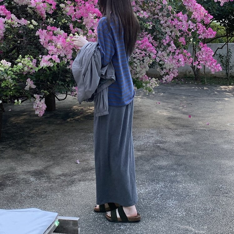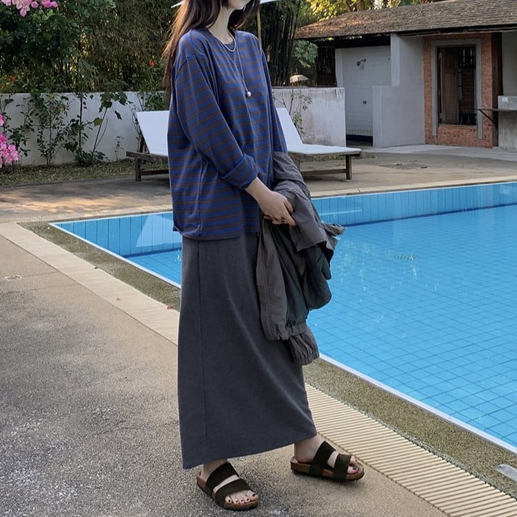 着回し力抜群のクルーネックブルーボーダーロングTシャツです。