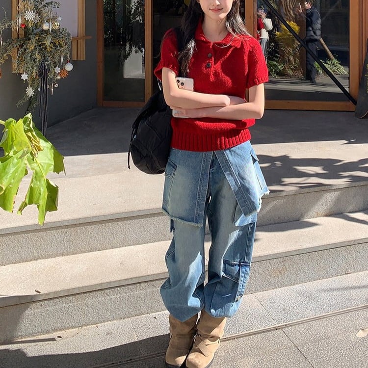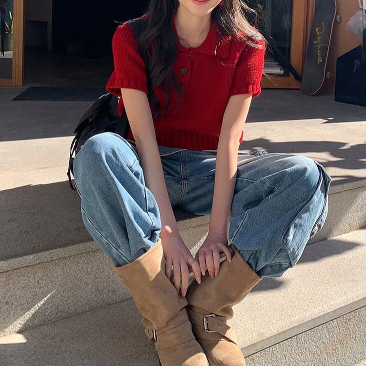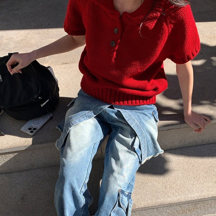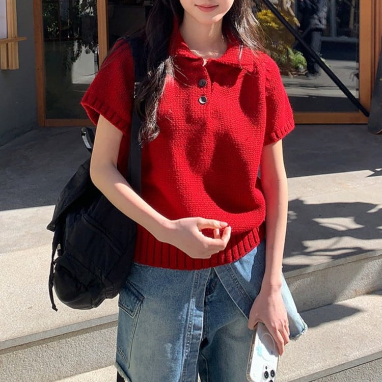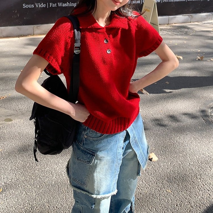 上品とカジュアルを叶える半袖ポロチャンキーニットです。