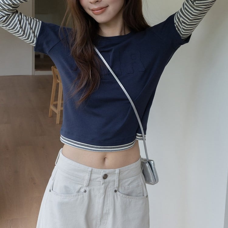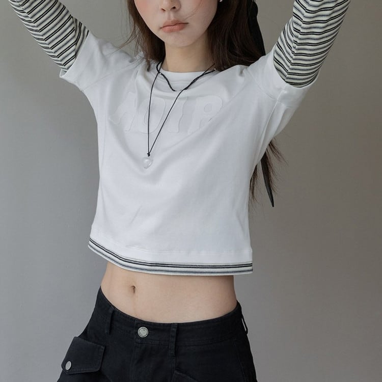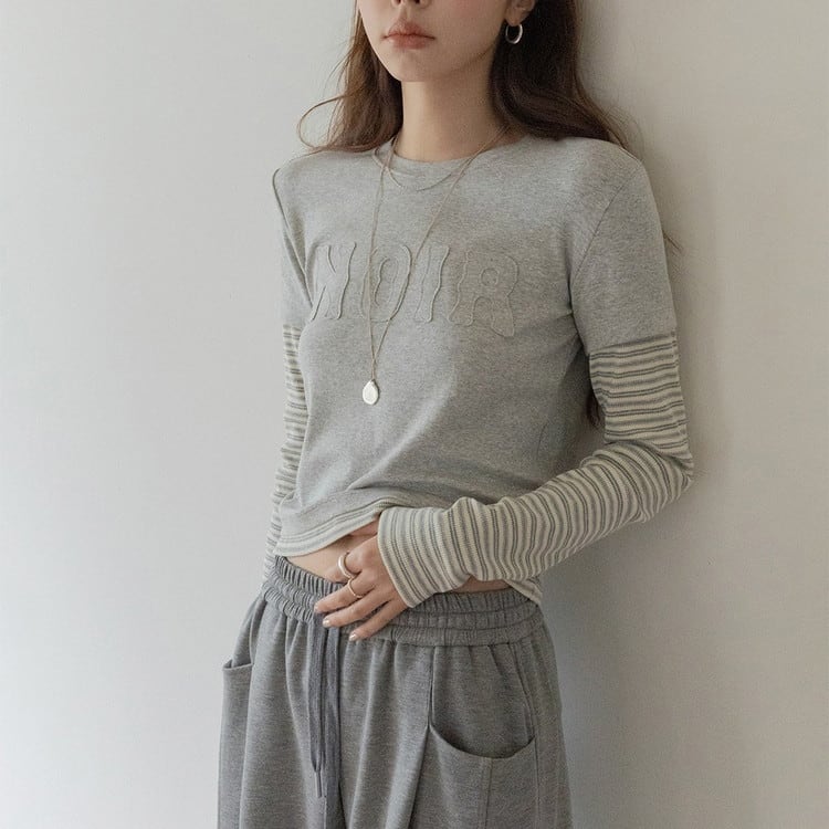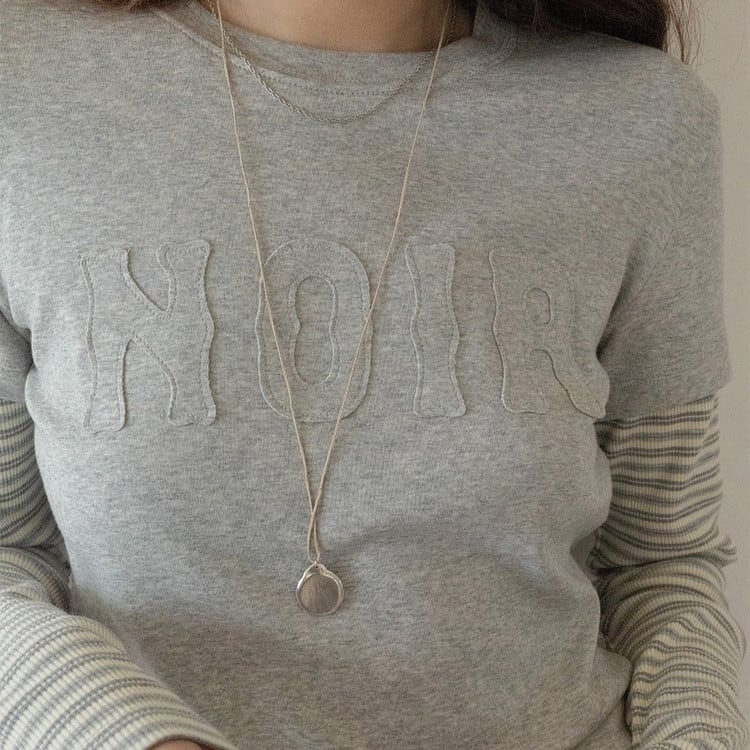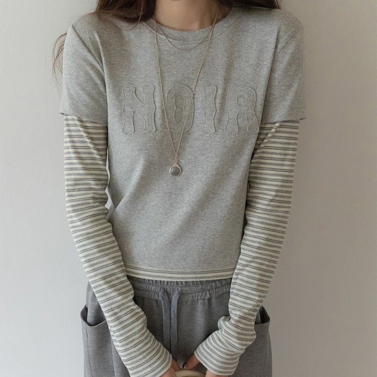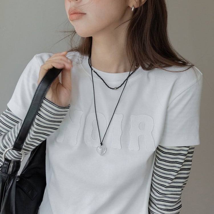 トレンド感のあるフェイクレイヤードロゴパッチロングTシャツです。