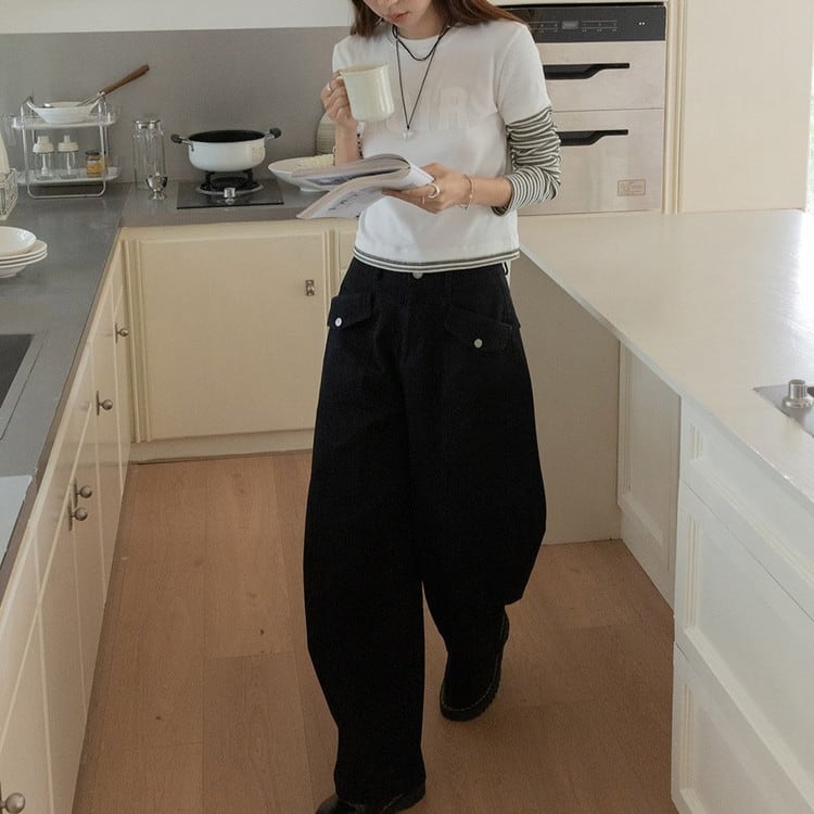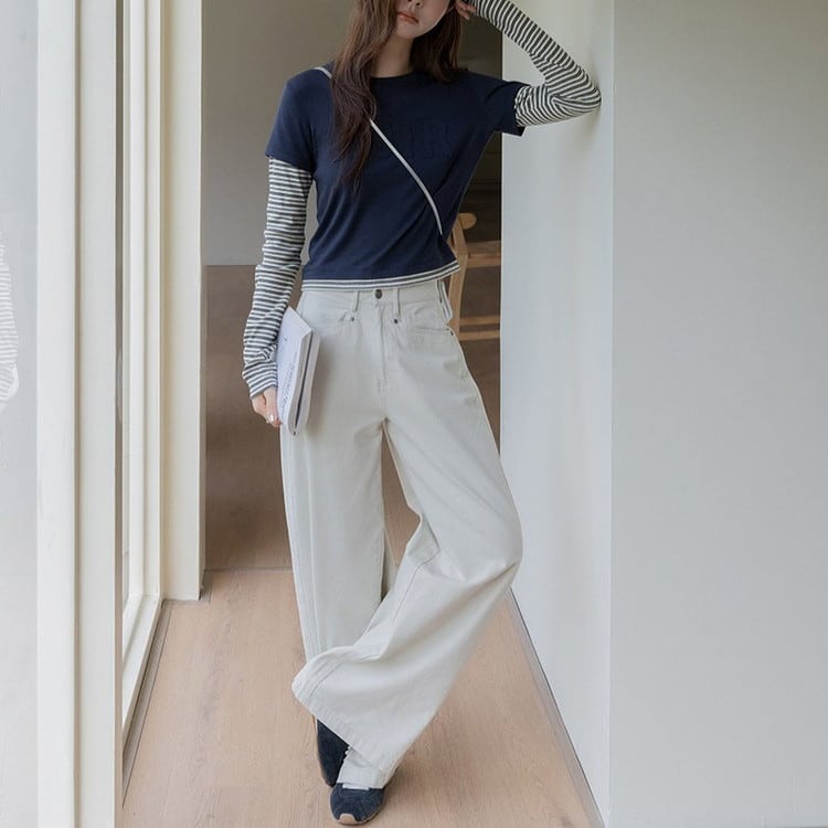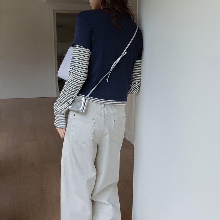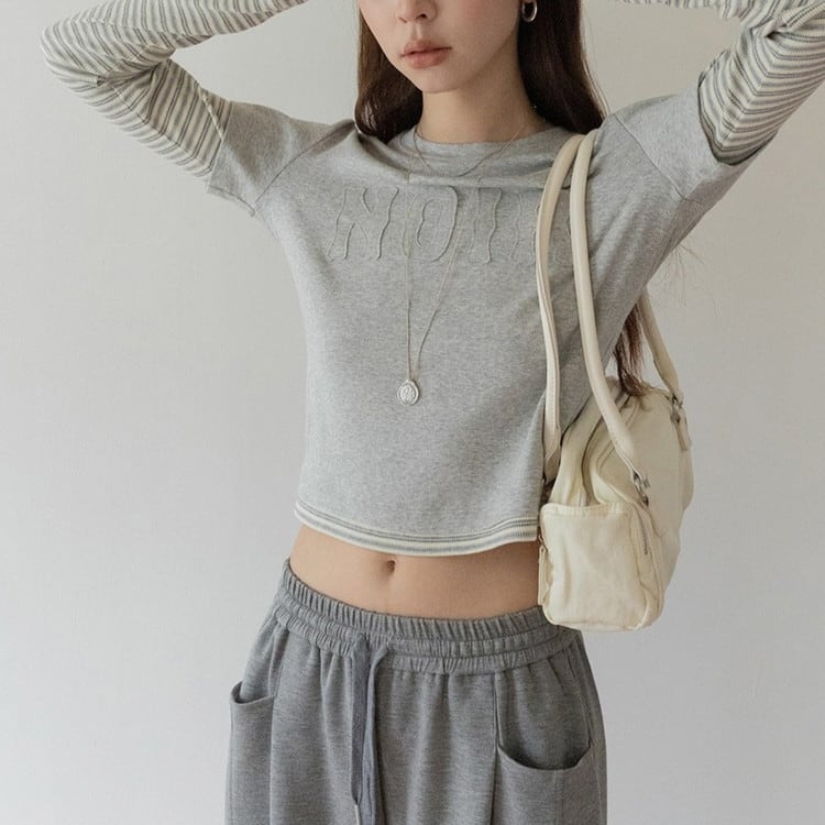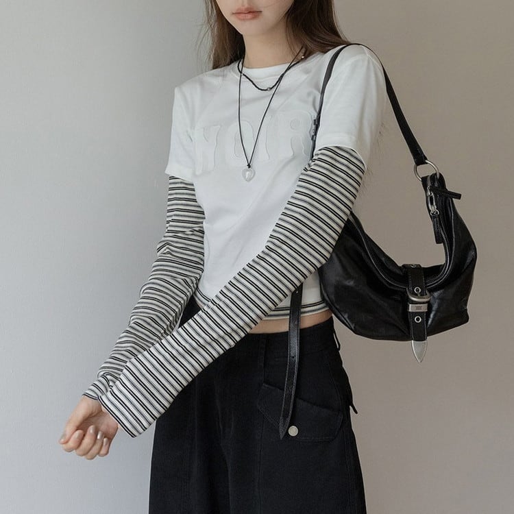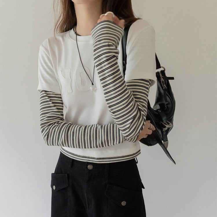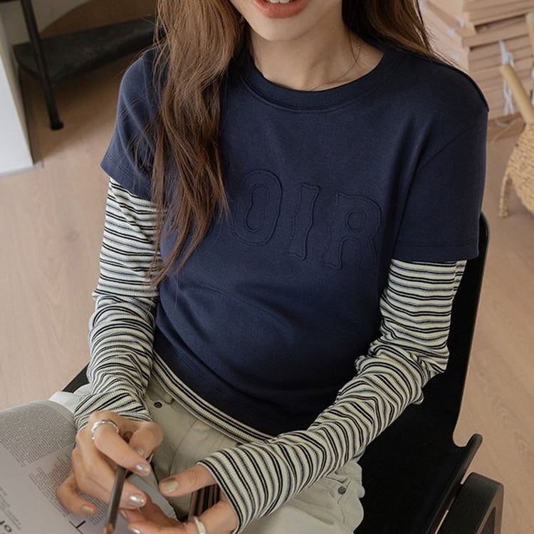 トレンド感のあるフェイクレイヤードロゴパッチロングTシャツです。