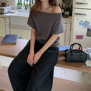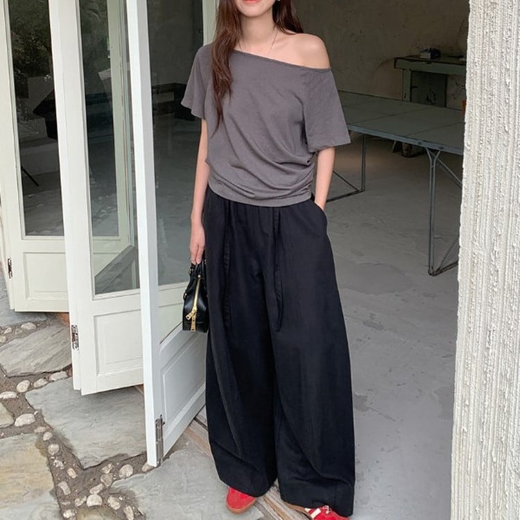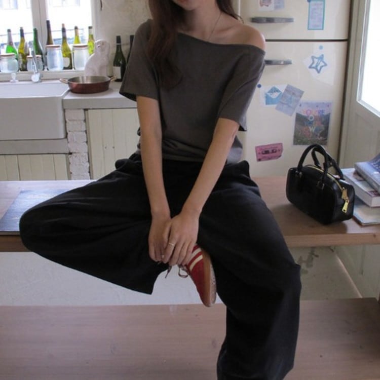 大人っぽい女性らしさを引き立ててくれるオフショルダー半袖Tシャツです。