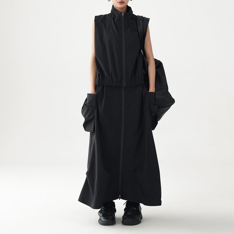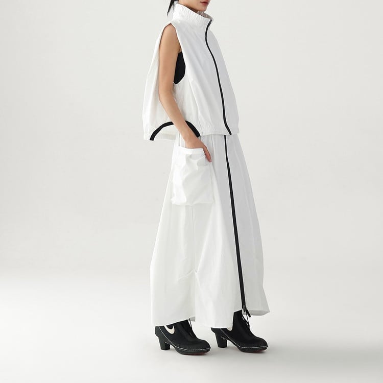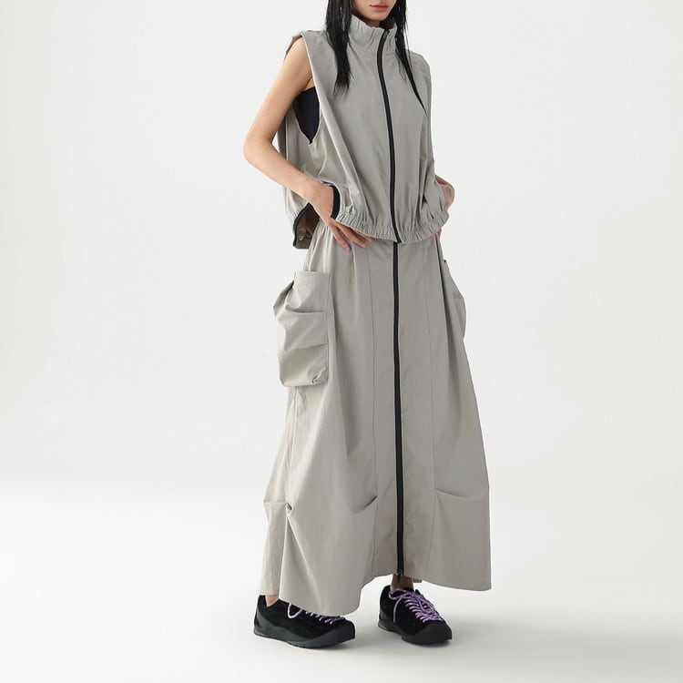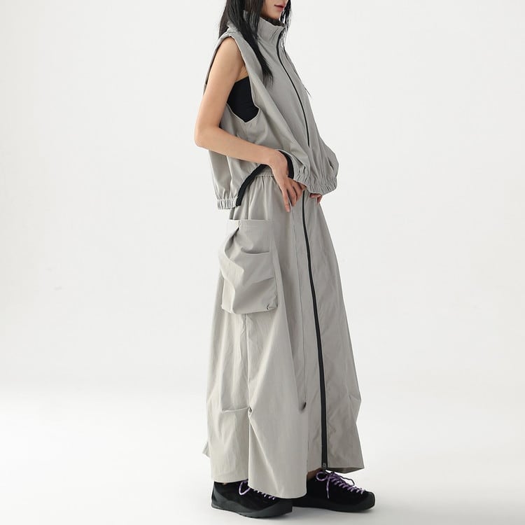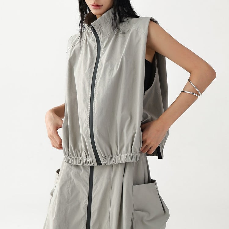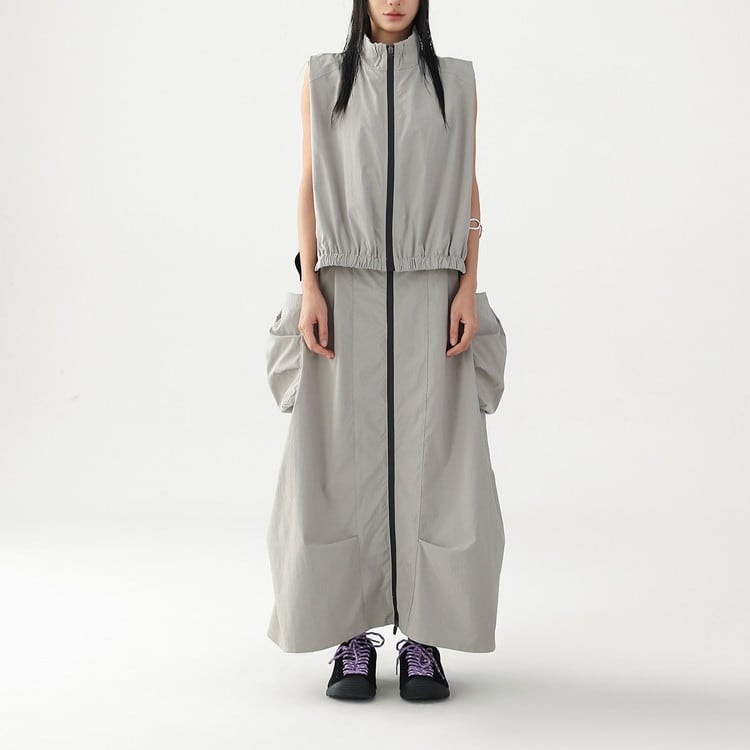 おしゃれ度アップすること間違いなしのジップアップベストスカートセットアップです。