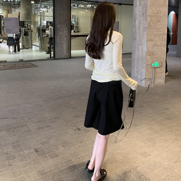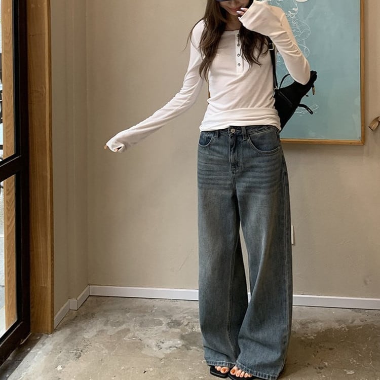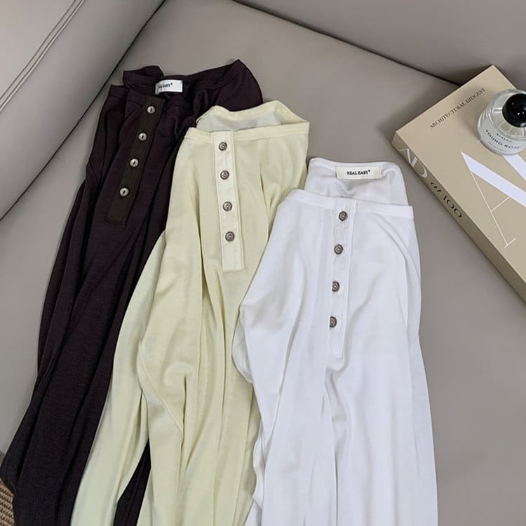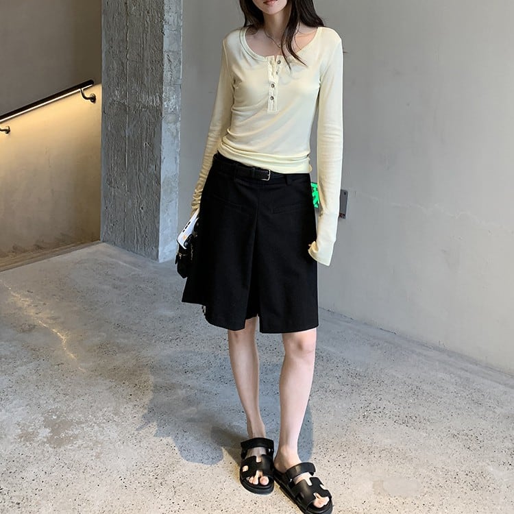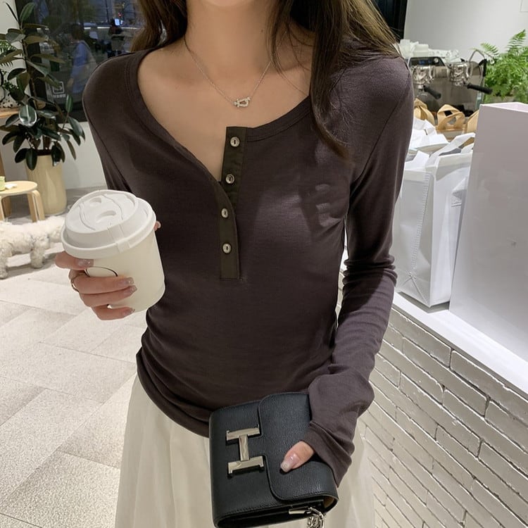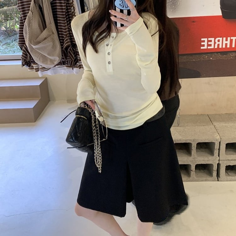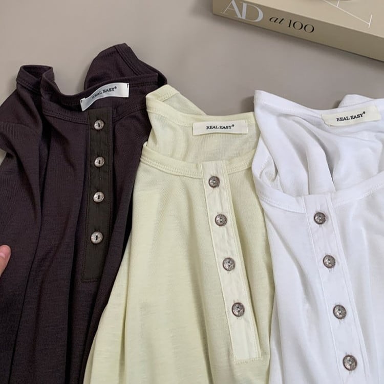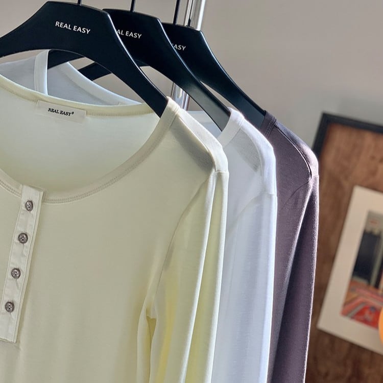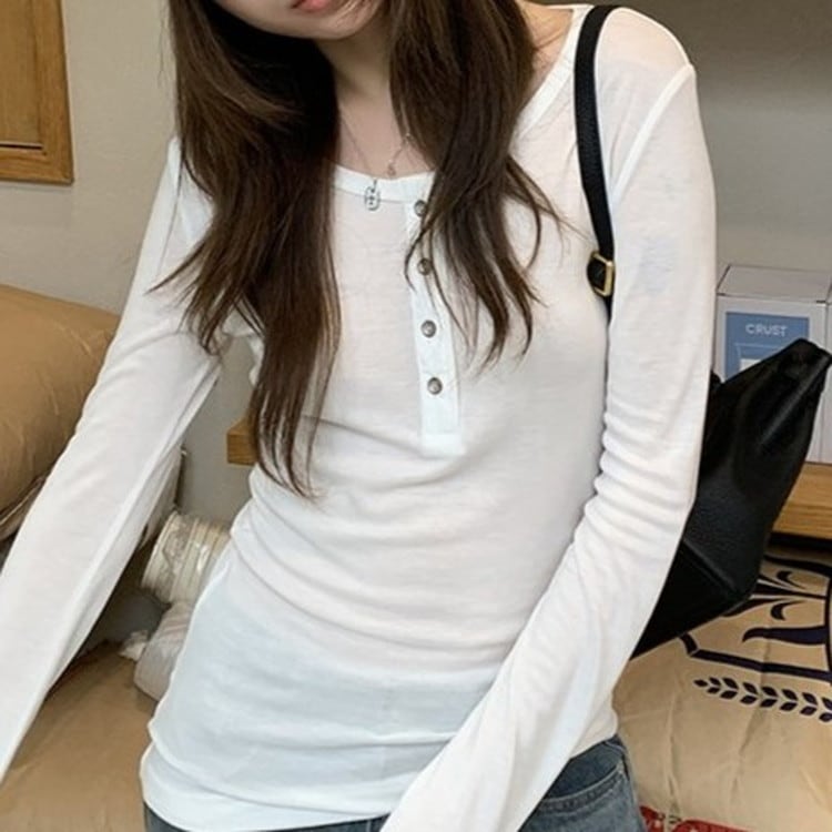 女性らしい印象のヘンリーネックシアーロングTシャツです。