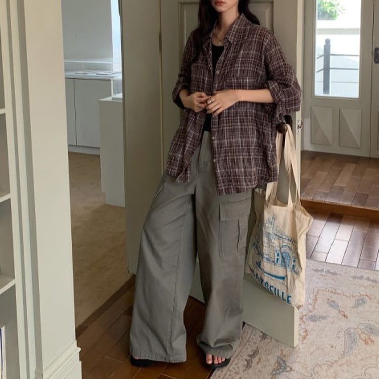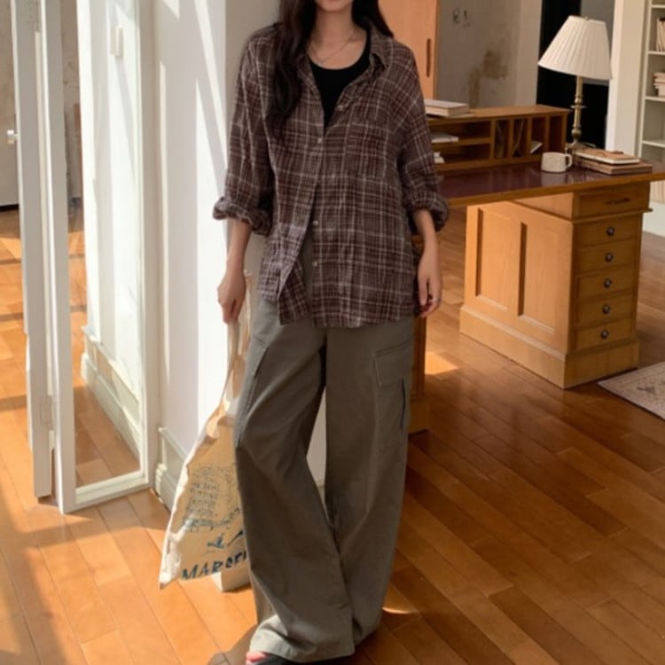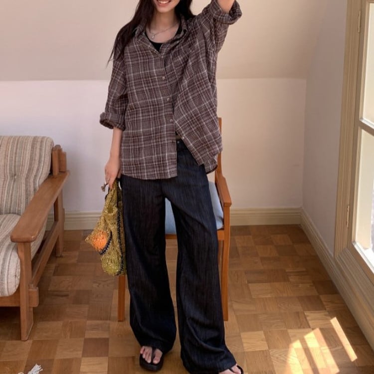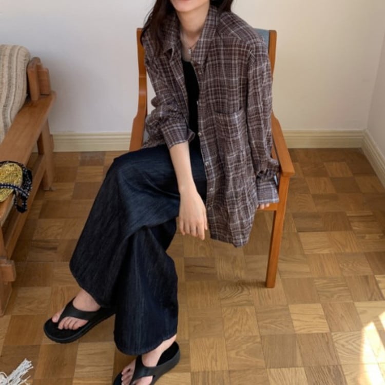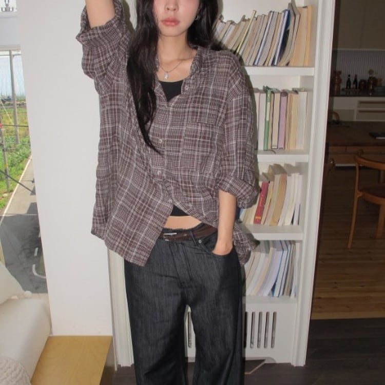 風を感じる軽やかなオーバーサイズブラウンチェックシャツです。