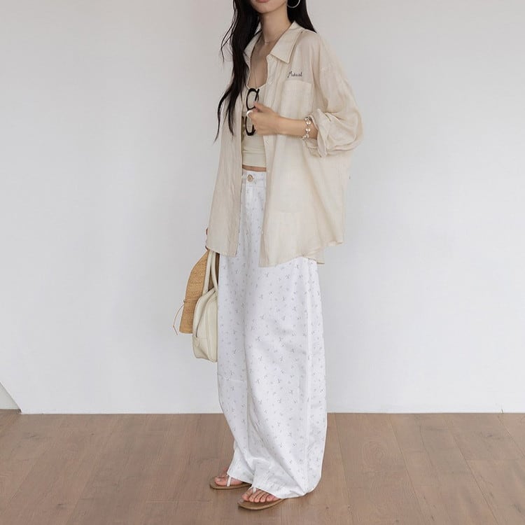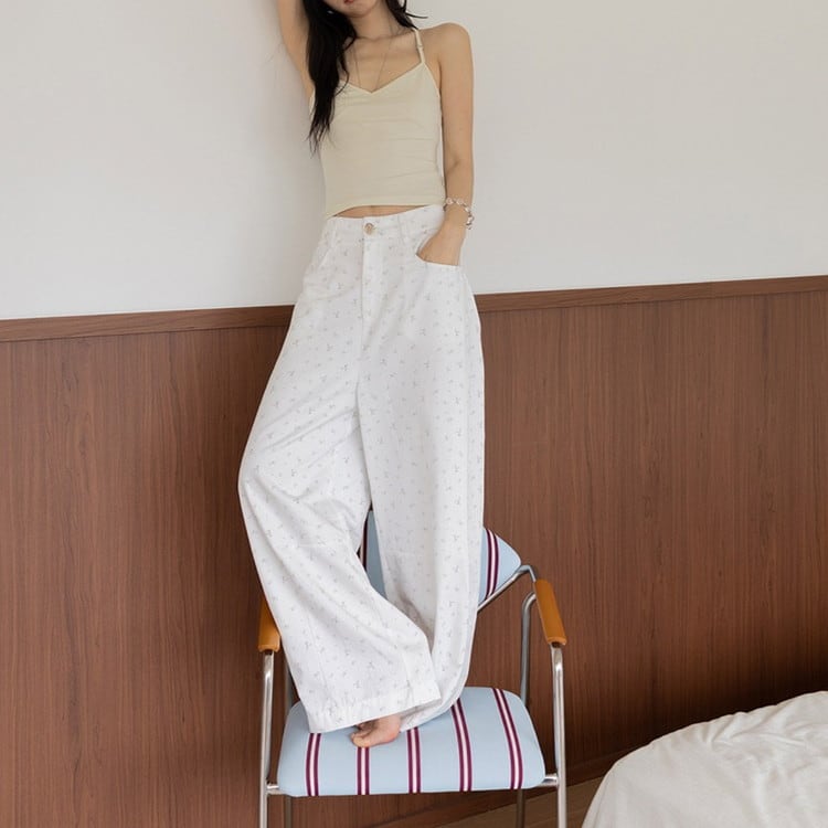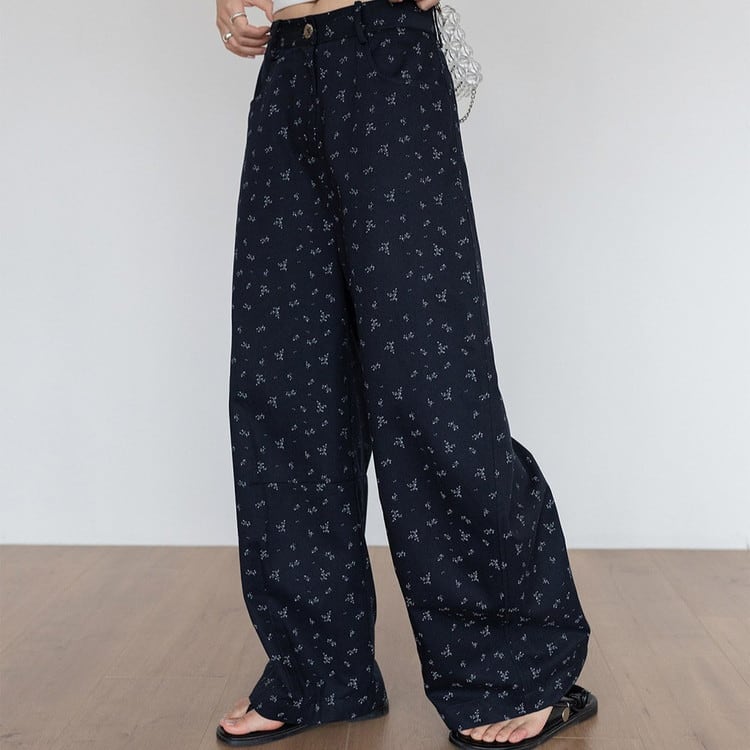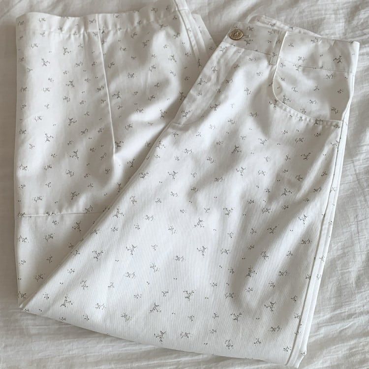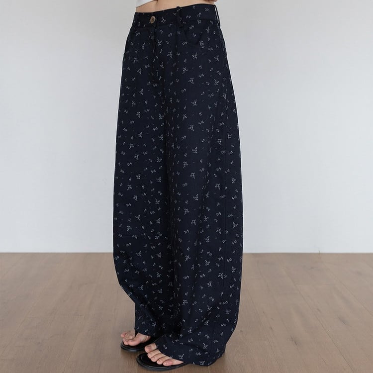 ガーリーなテンセル総柄ワイドパンツです。